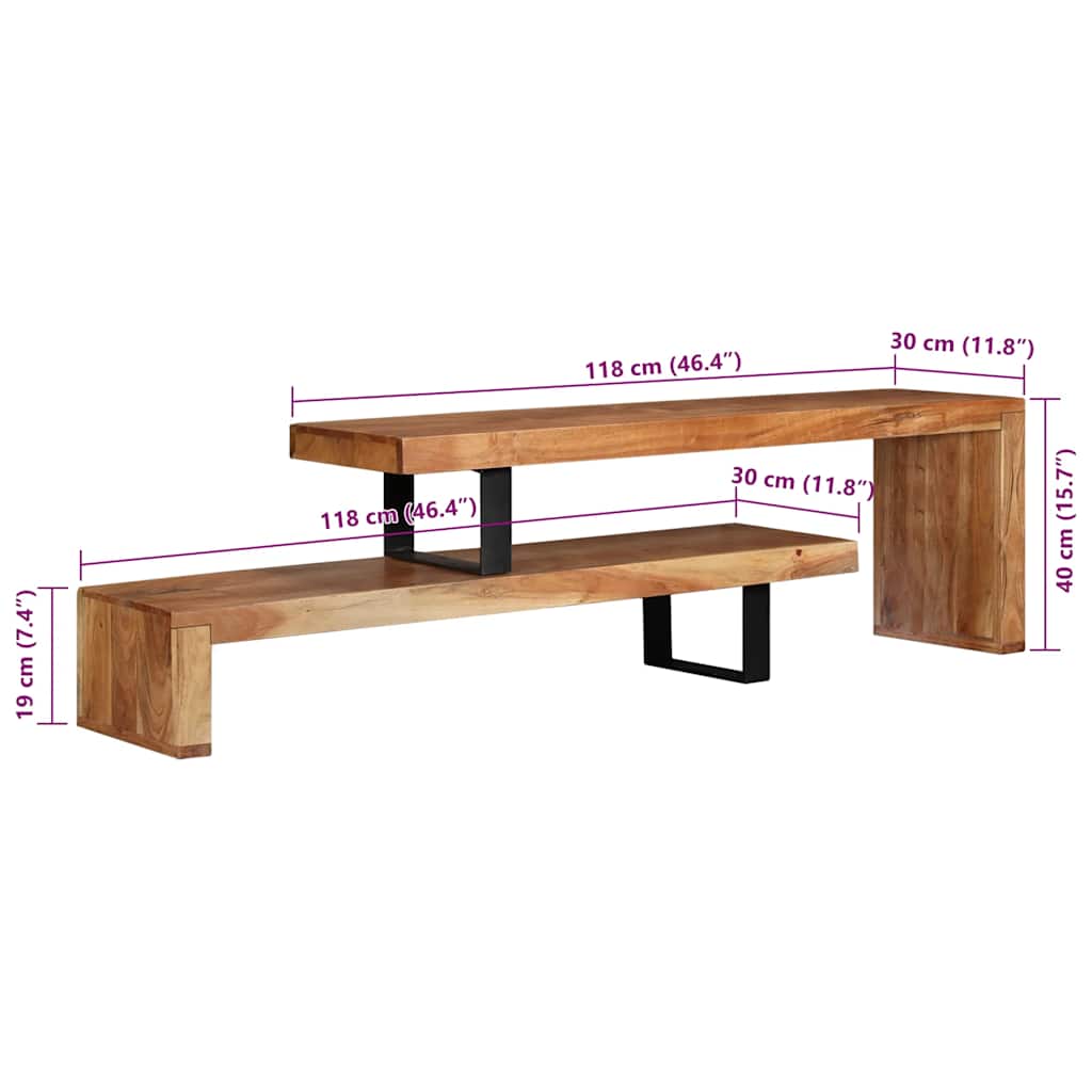 Tento unikátní televizní stolek se skládá ze dvou stohovatelných částí, které můžete umístit dle libosti. Je vyrobený z akáciového masivu, jehož vintage vzhled skvěle doplní váš interiér. Odlišnosti ve struktuře a barvě dřeva mu dodávají jedinečný charakter.