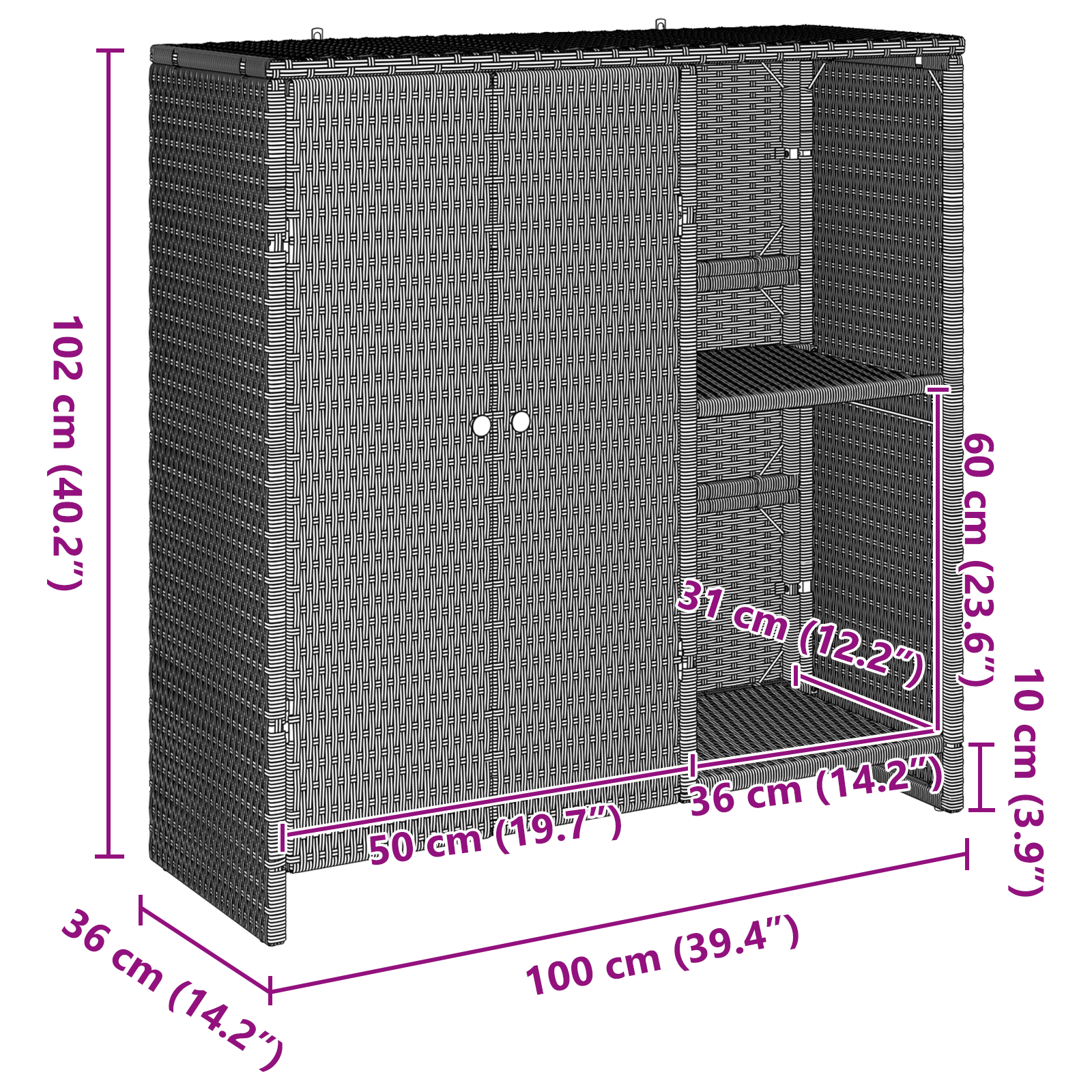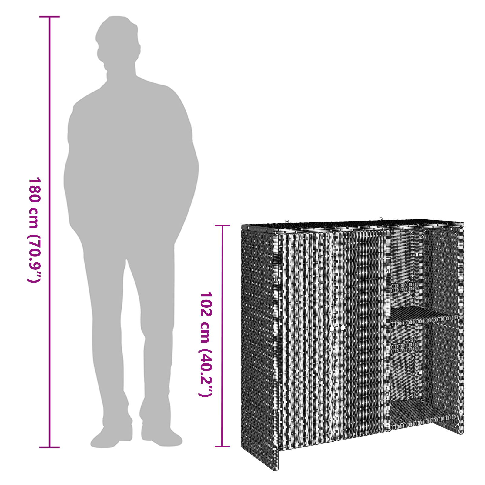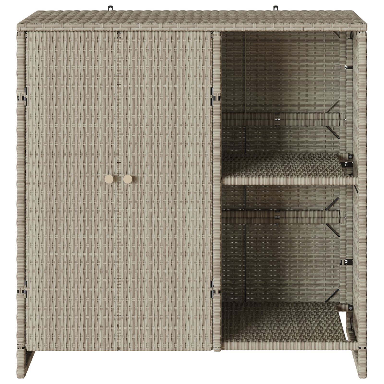 Tahle moderní úložná skříň je ideální do obývacího pokoje a spojuje praktičnost s moderním šarmem. S obdélníkovým designem nabízí spoustu úložného prostoru a dodává zajímavý minimalistický vzhled každému interiéru. Perfektní pro uspořádání vašich věcí, skříň je nejen hezká, ale i funkční, vhodná pro různé úložné potřeby. S pomocí odolného ratanu a silné konstrukce, skříň bude ve vašem domově dlouho sloužit a naplní váš prostor jednoduchostí a přitažlivostí.