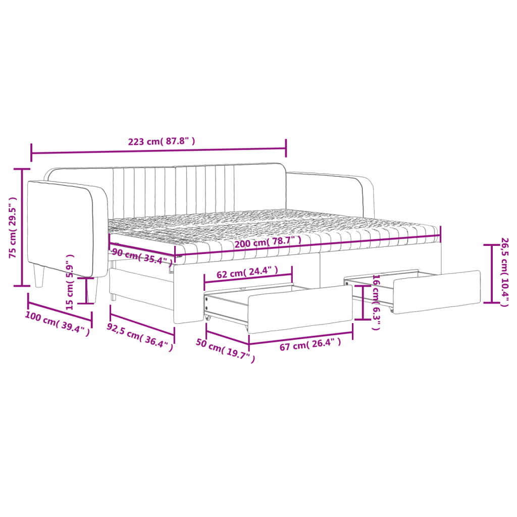 Válenda s přistýlkou a zásuvkami tmavě šedá 90 x 200 cm samet