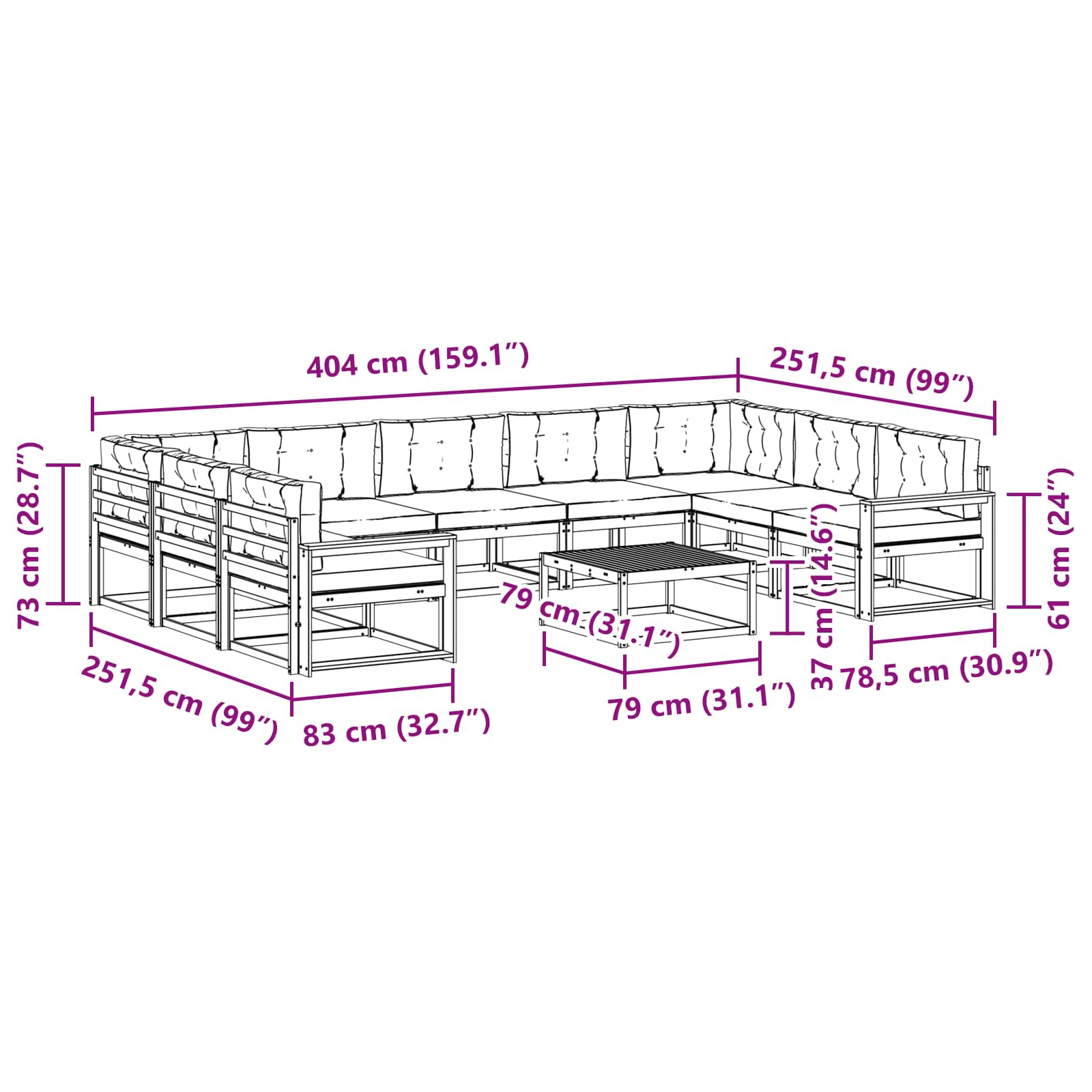 • 7 x Střední pohovka: 79 x 83 x 73 cm (D x Š x V)