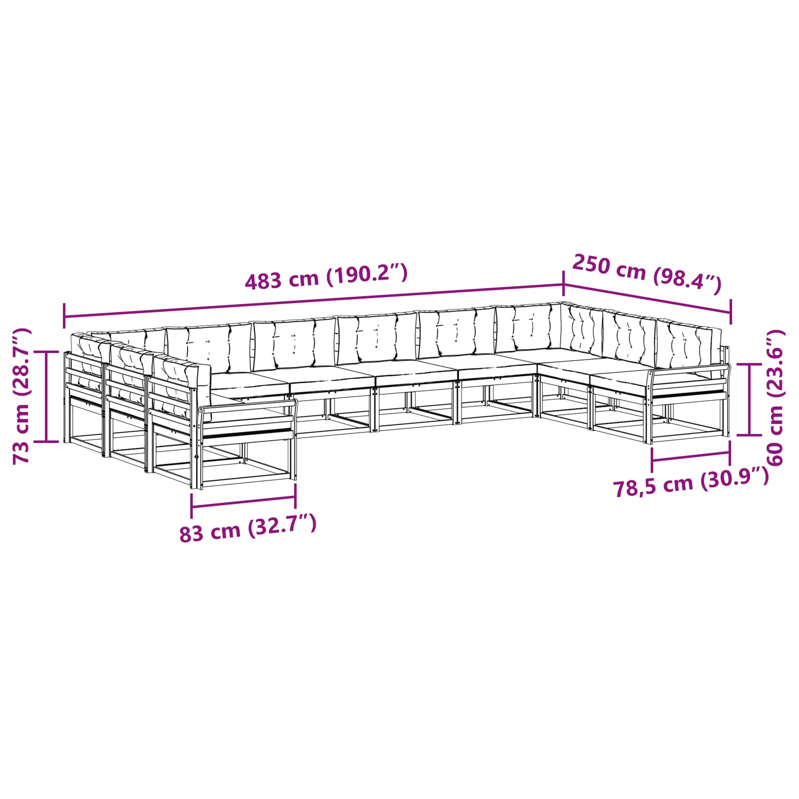 • 8 x Střední pohovka: 79 x 83 x 73 cm (D x Š x V)