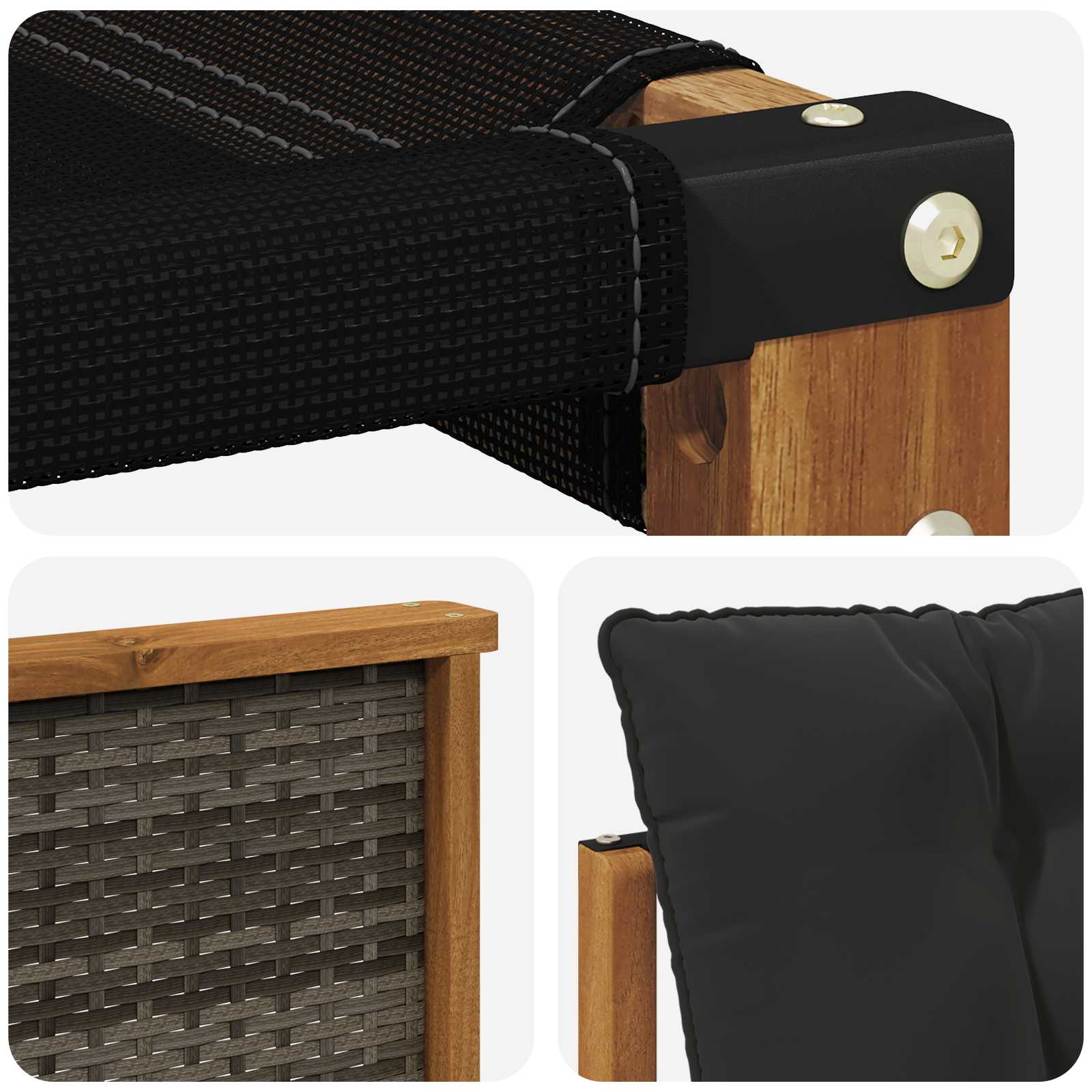 Tato souprava venkovního nábytku spojuje styl a funkčnost a stává se tak centrem pozornosti na každé zahradě nebo terase. S moderním designem a minimalistickým provedením dodává elegance a podporuje odpočinek či společenské chvíle. Vyrobena z masivního akáciového dřeva, zaručuje odolnost a pohledovou atraktivitu pro praktické a vkusné venkovní interiéry.