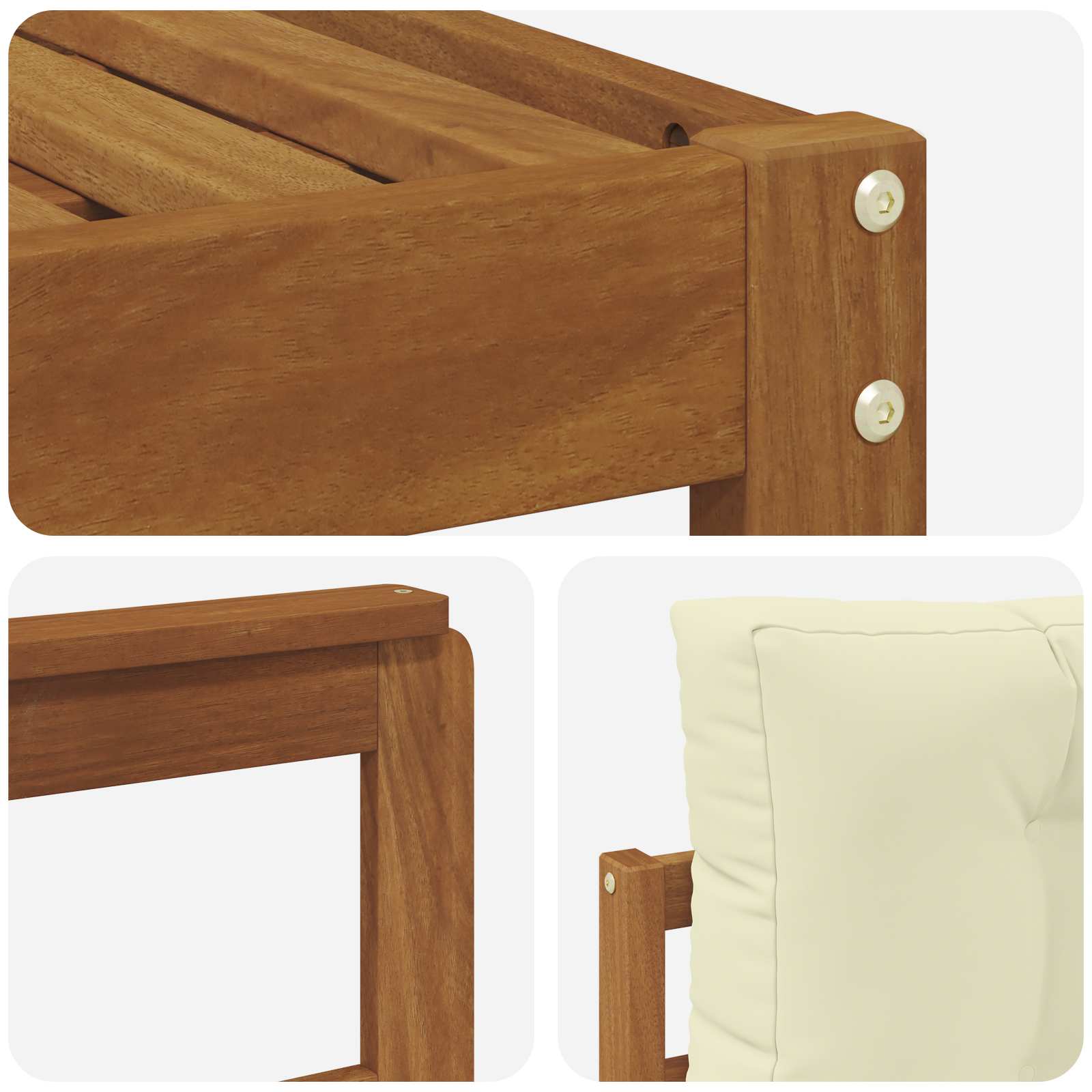 • Masivní akáciové dřevo: Souprava je z odolného akáciového dřeva, které zajišťuje dlouhotrvající užívání a odolává povětrnostním vlivům, takže vypadá stále skvěle. Přírodní vzory dřeva dodávají vaší zahradě přirozenou eleganci a zvyšují vizuální atraktivitu.