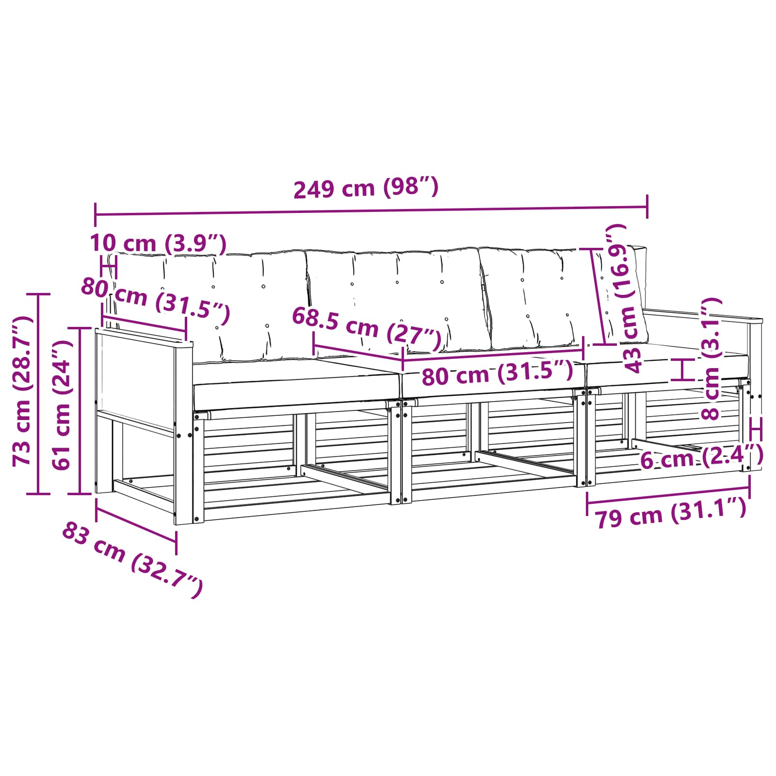 • 3 x Zadní polštář: 80 x 43 x 10 cm (D x Š x T)