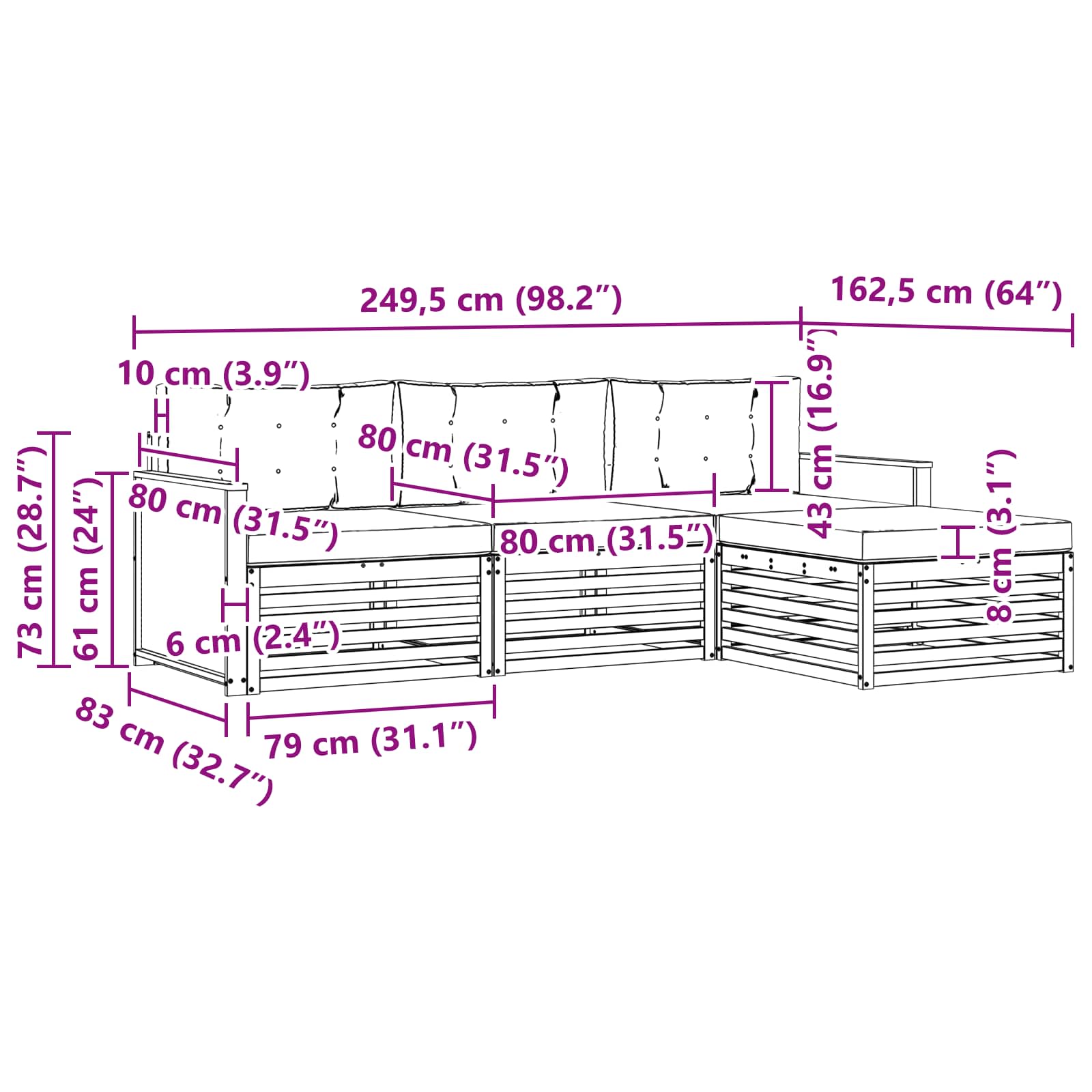 Sada venkovního nábytku spojuje styl a funkčnost, čímž vytváří atraktivní kus pro jakoukoli zahradu nebo terasu. Její moderní design, čisté linie a minimalistické detaily přidávají nádech elegance a podporují pohodlí a společenská setkání venku. Vyrobená z masivního akáciového dřeva, tato sada je odolná a trvanlivá, což z ní dělá ideální volbu pro ty, kdo chtějí jak praktičnost, tak hezký design venkovního nábytku.