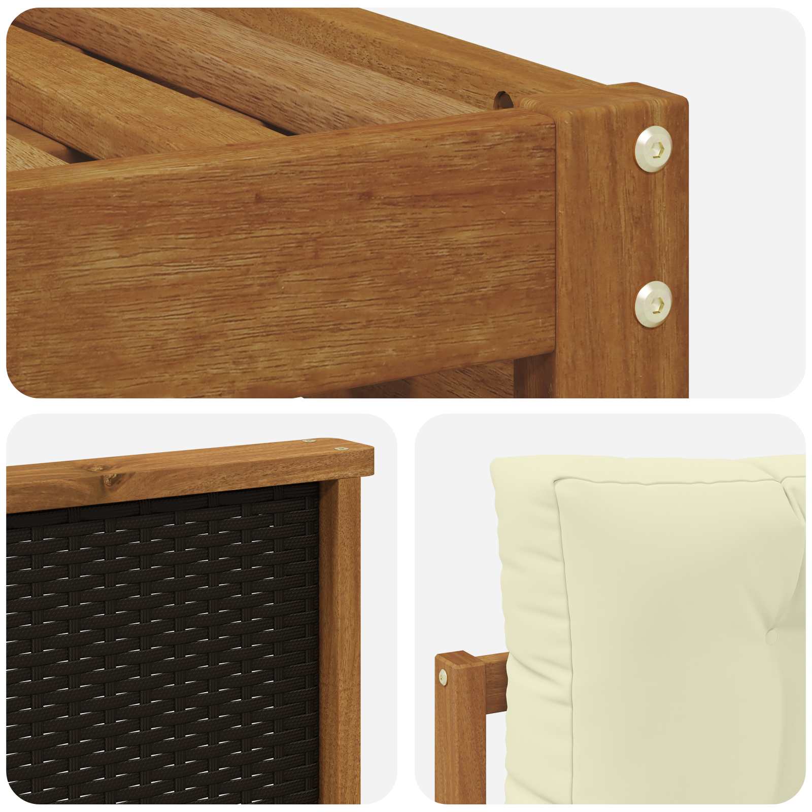 • Odolné masivní akáciové dřevo: Tato venkovní sada je vyrobena z masivního akáciového dřeva, které je známé svojí odolností a výdrží do každého počasí. Pevná konstrukce zajišťuje trvanlivost a stabilitu a teplý přírodní odstín krásně ladí s tvou zahradou nebo terasou.