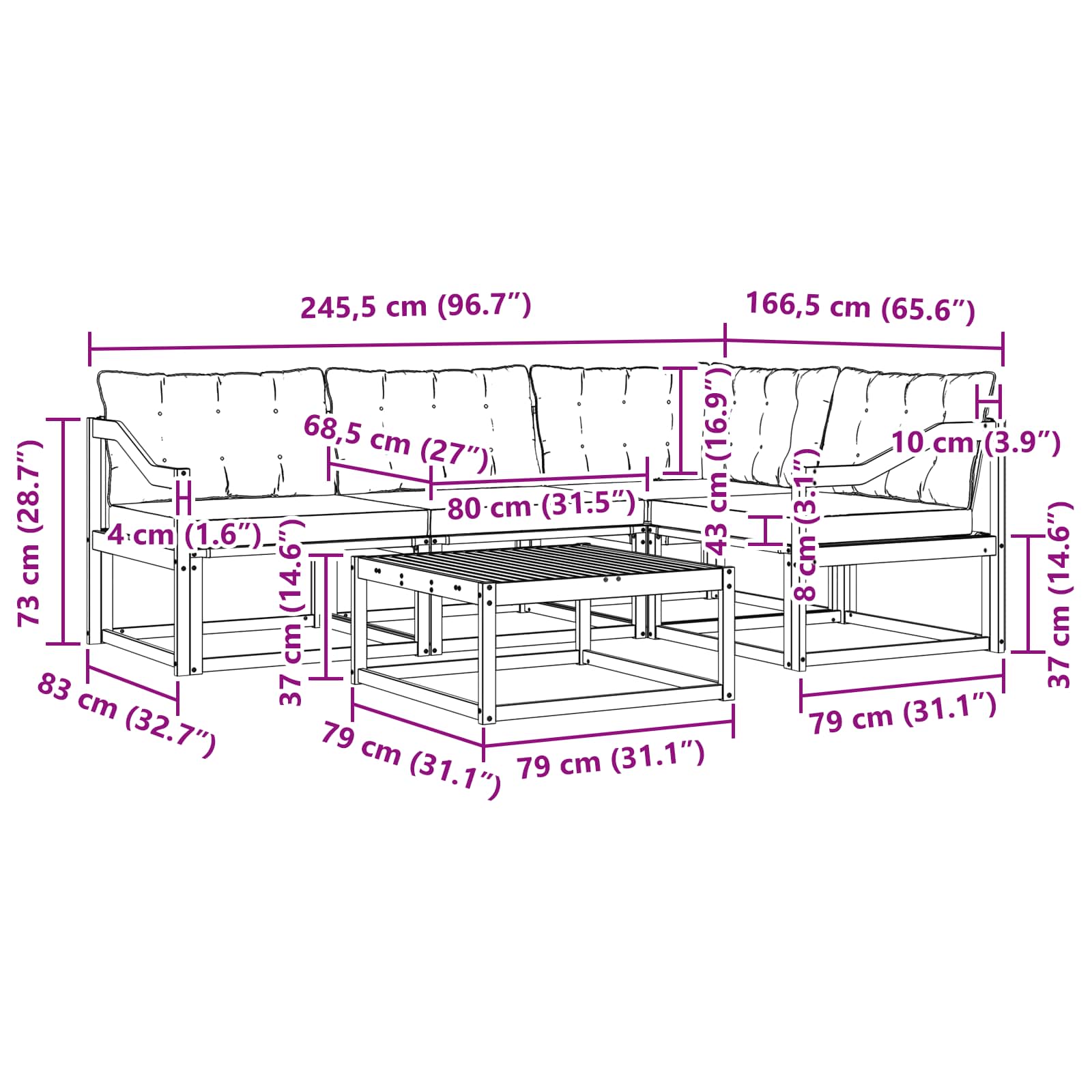• 3 x Střední pohovka: 79 x 83 x 73 cm (D x Š x V)