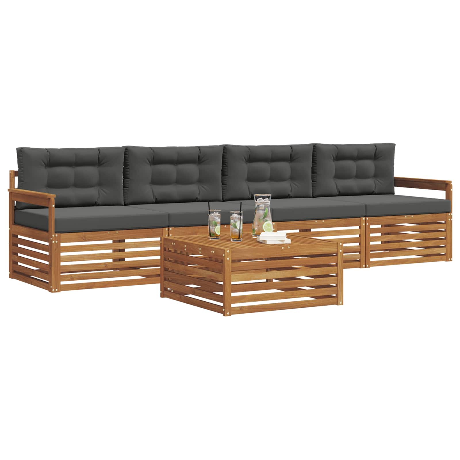 Tato sada venkovního nábytku kombinuje styl a funkčnost a stává se tak středobodem každé zahrady nebo terasy. S moderním designem, čistými liniemi a minimálním zdobením vypadá elegantně a zároveň je ideální pro relaxaci a společenská setkání. Celá z masivní akácie, zajišťuje trvanlivost a vizuální přitažlivost, což ji činí dokonalou volbou pro ty, co žádají praktičnost a hezký design venkovního nábytku.
