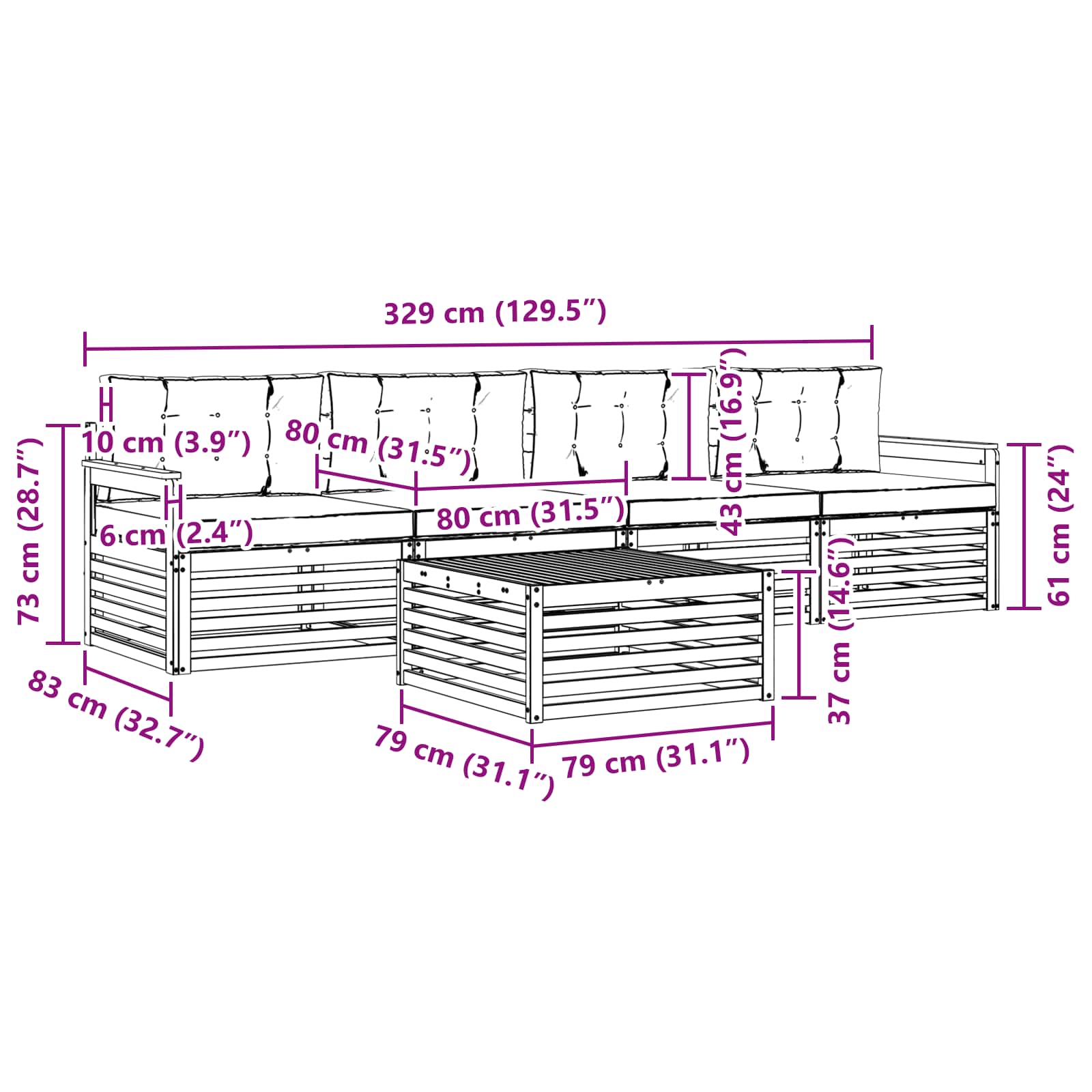 • 4 x Střední pohovka: 79 x 83 x 73 cm (ŠxHxV)