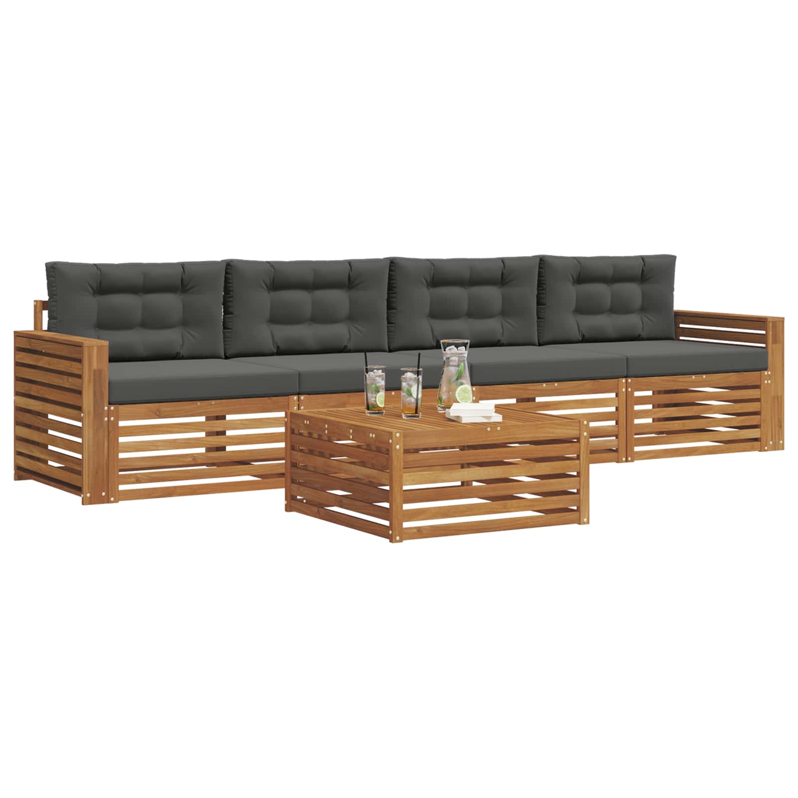 Tato sada venkovního nábytku kombinuje styl a funkčnost a stává se tak středobodem každé zahrady nebo terasy. S moderním designem, čistými liniemi a minimálním zdobením vypadá elegantně a zároveň je ideální pro relaxaci a společenská setkání. Celá z masivní akácie, zajišťuje trvanlivost a vizuální přitažlivost, což ji činí dokonalou volbou pro ty, co žádají praktičnost a hezký design venkovního nábytku.