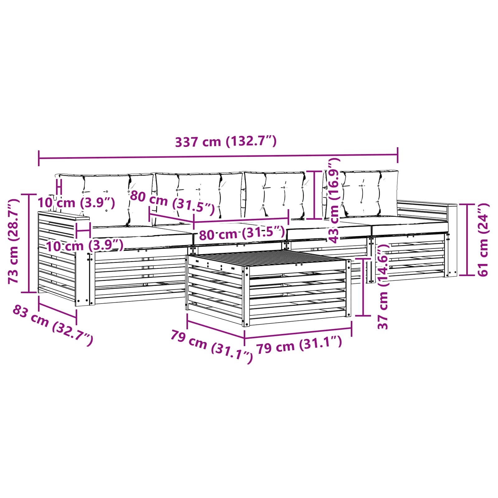 • 4 x Střední pohovka: 79 x 83 x 73 cm (ŠxHxV)