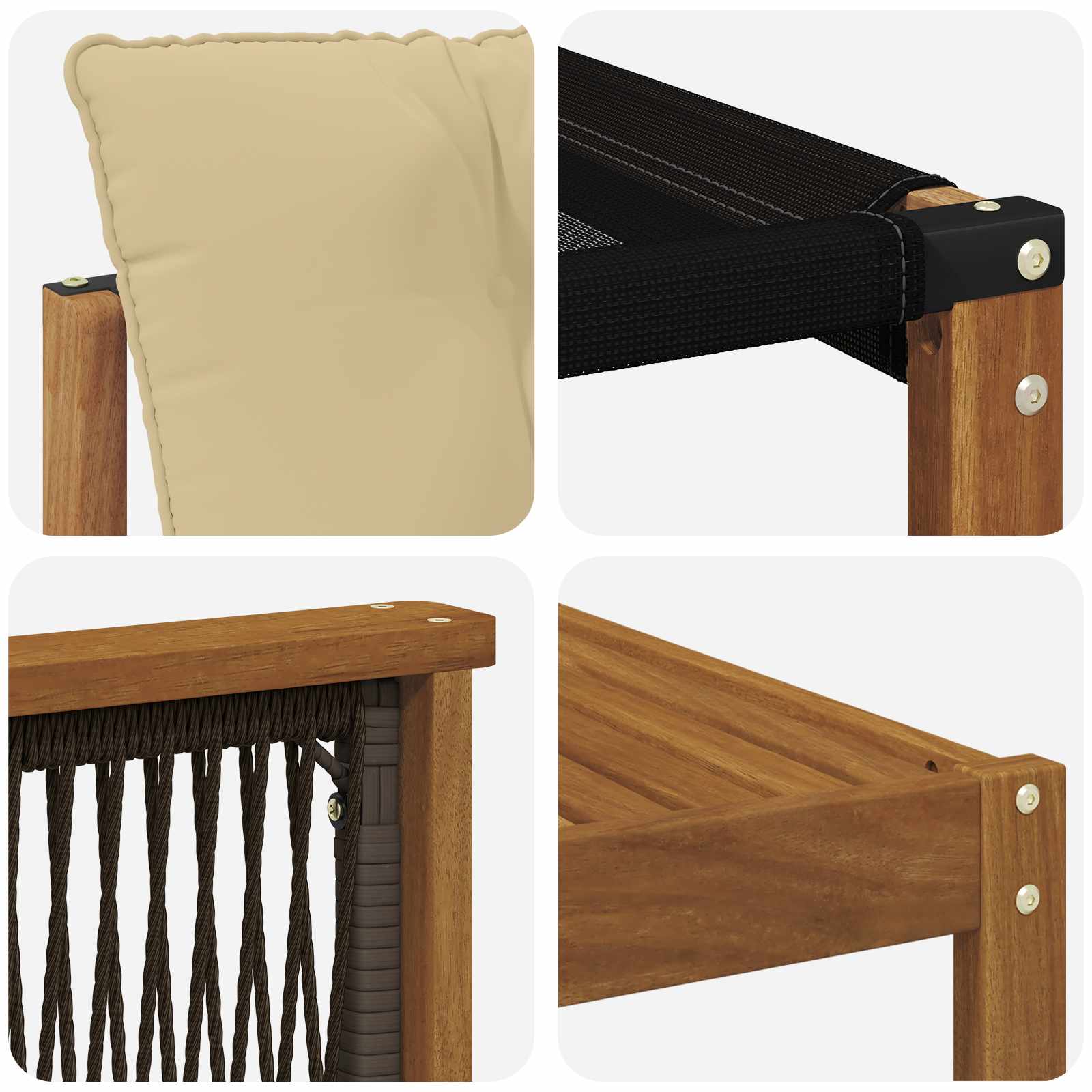 • Rám z akáciového dřeva: Tato souprava se pyšní pevným rámem z akáciového dřeva, které je odolné a má krásnou texturu, jež obohacuje váš venkovní dekor. Jeho barva dodává teplý vzhled a zaručuje dlouhou životnost pro každodenní používání.