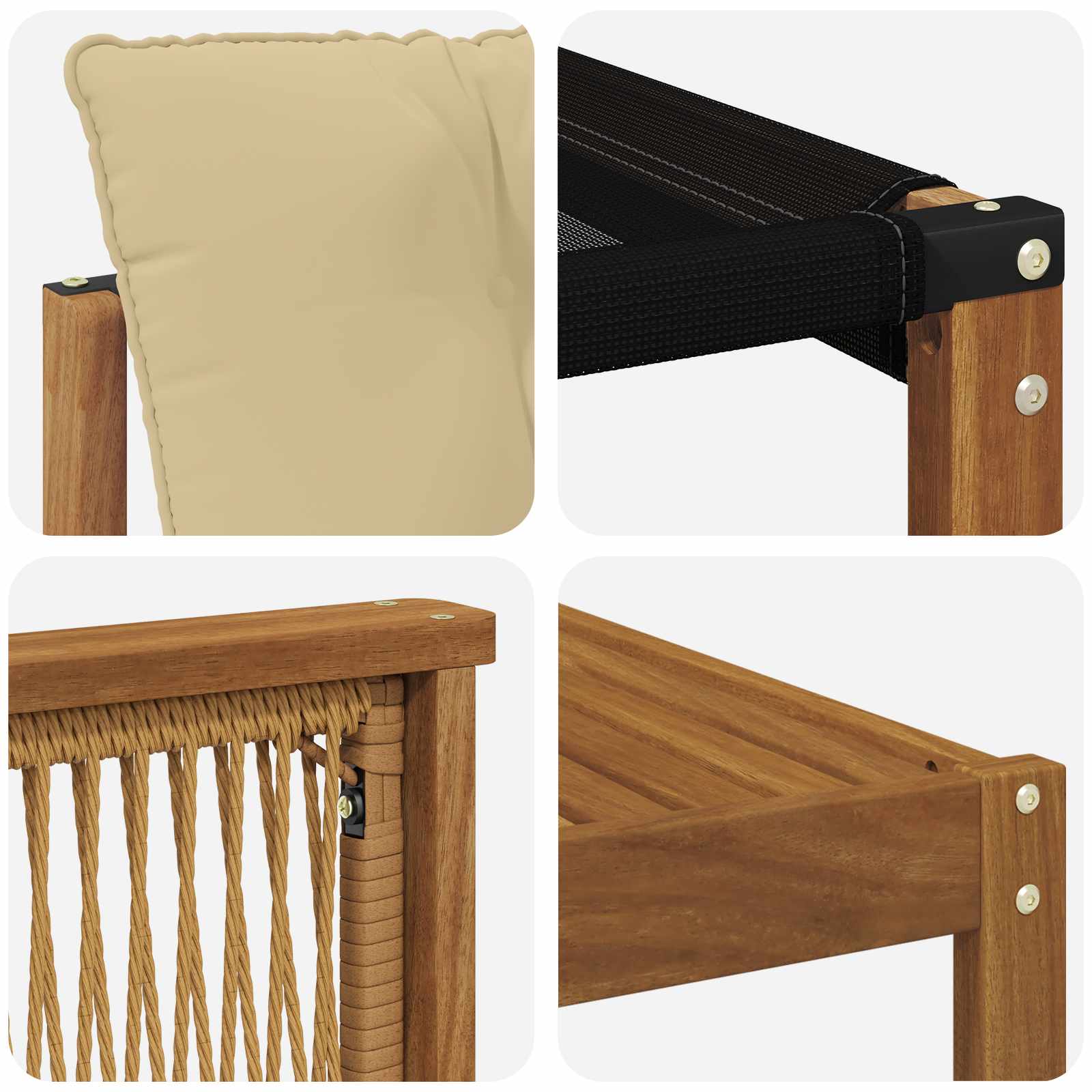 • Rám z akáciového dřeva: Tato souprava se pyšní pevným rámem z akáciového dřeva, které je odolné a má krásnou texturu, jež obohacuje váš venkovní dekor. Jeho barva dodává teplý vzhled a zaručuje dlouhou životnost pro každodenní používání.