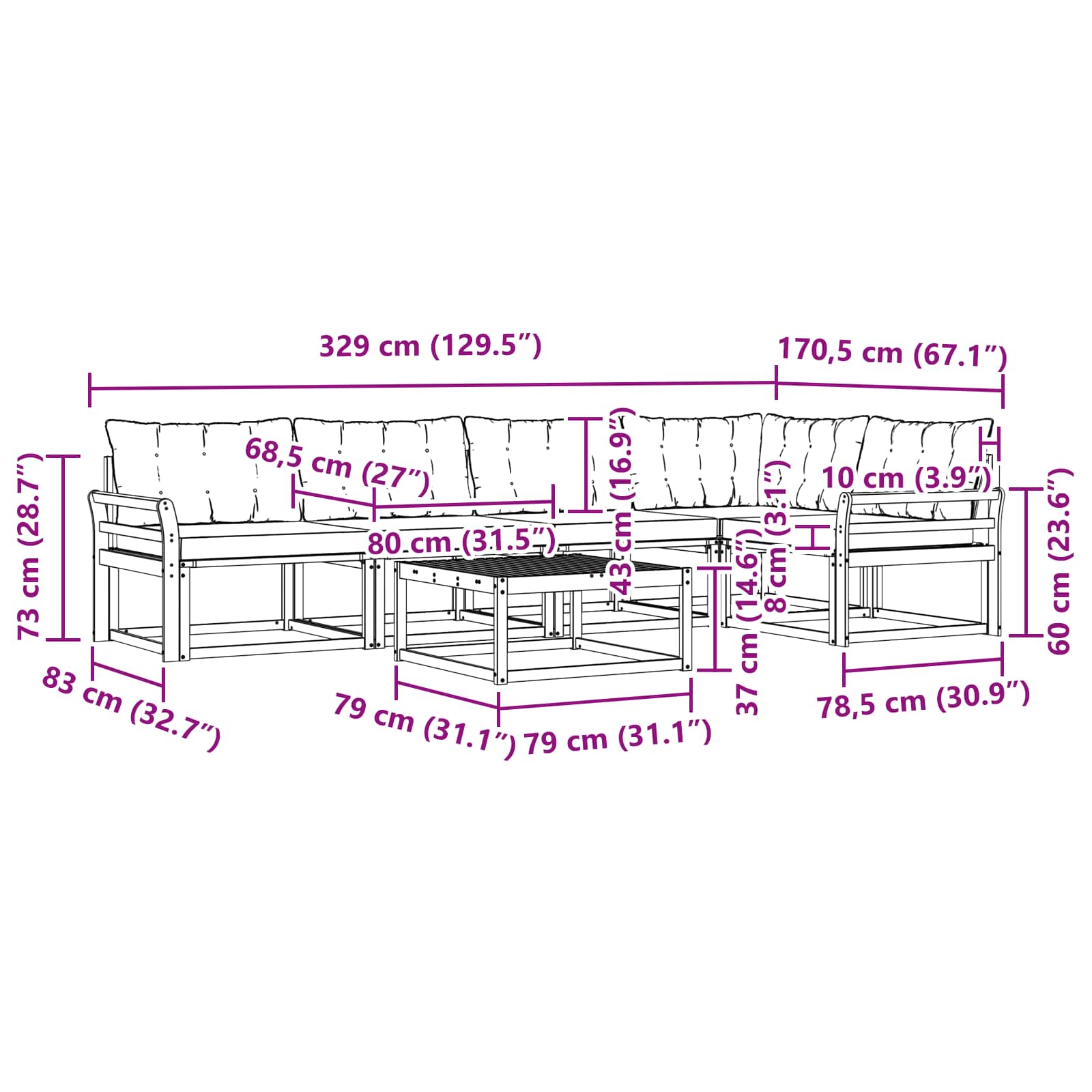 • 4 x Střední pohovka: 79 x 83 x 73 cm (D x Š x V)