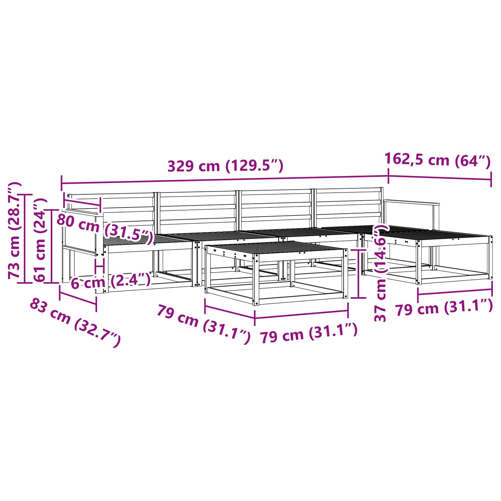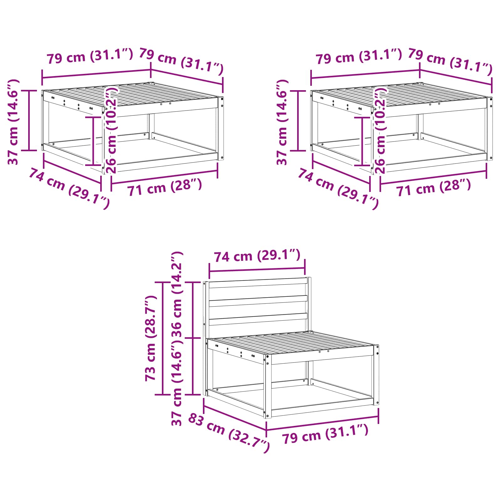 • 4 x Střední pohovka: 79 x 83 x 73 cm (D x Š x V)