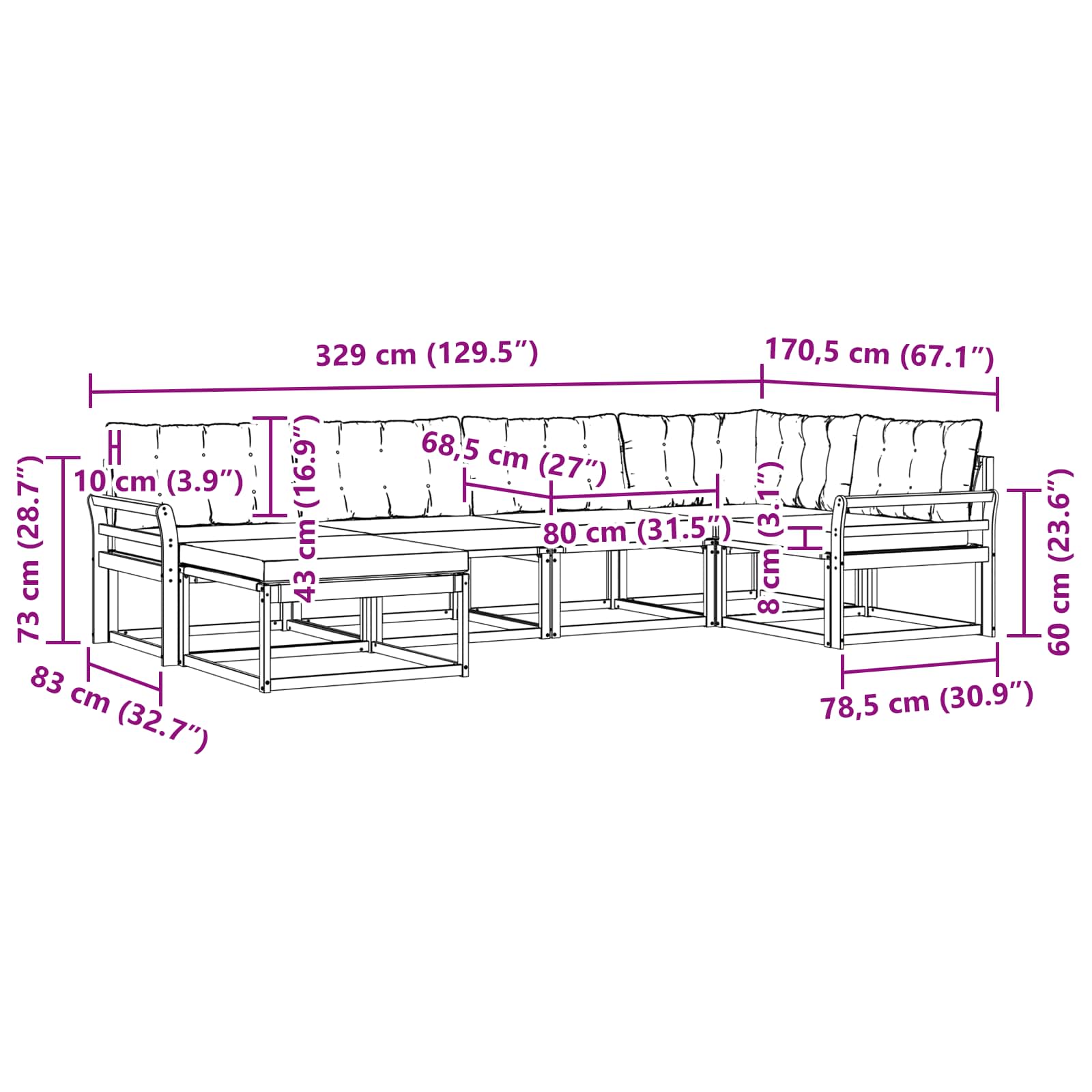 • 4 x Střední pohovka: 59 x 63 x 73 cm (D x Š x V)