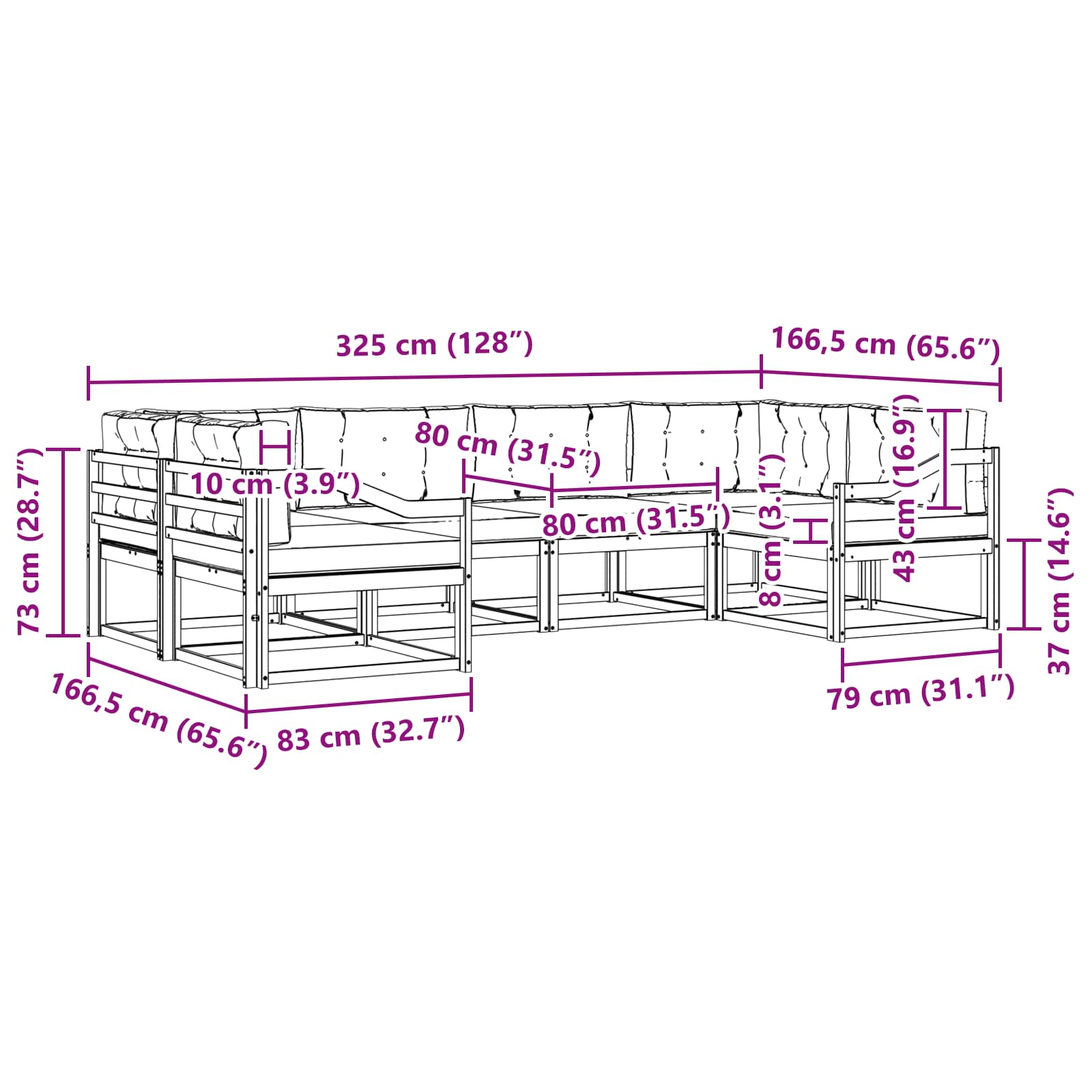 • 4 x Střední pohovka: 79 x 83 x 73 cm (D x Š x V)