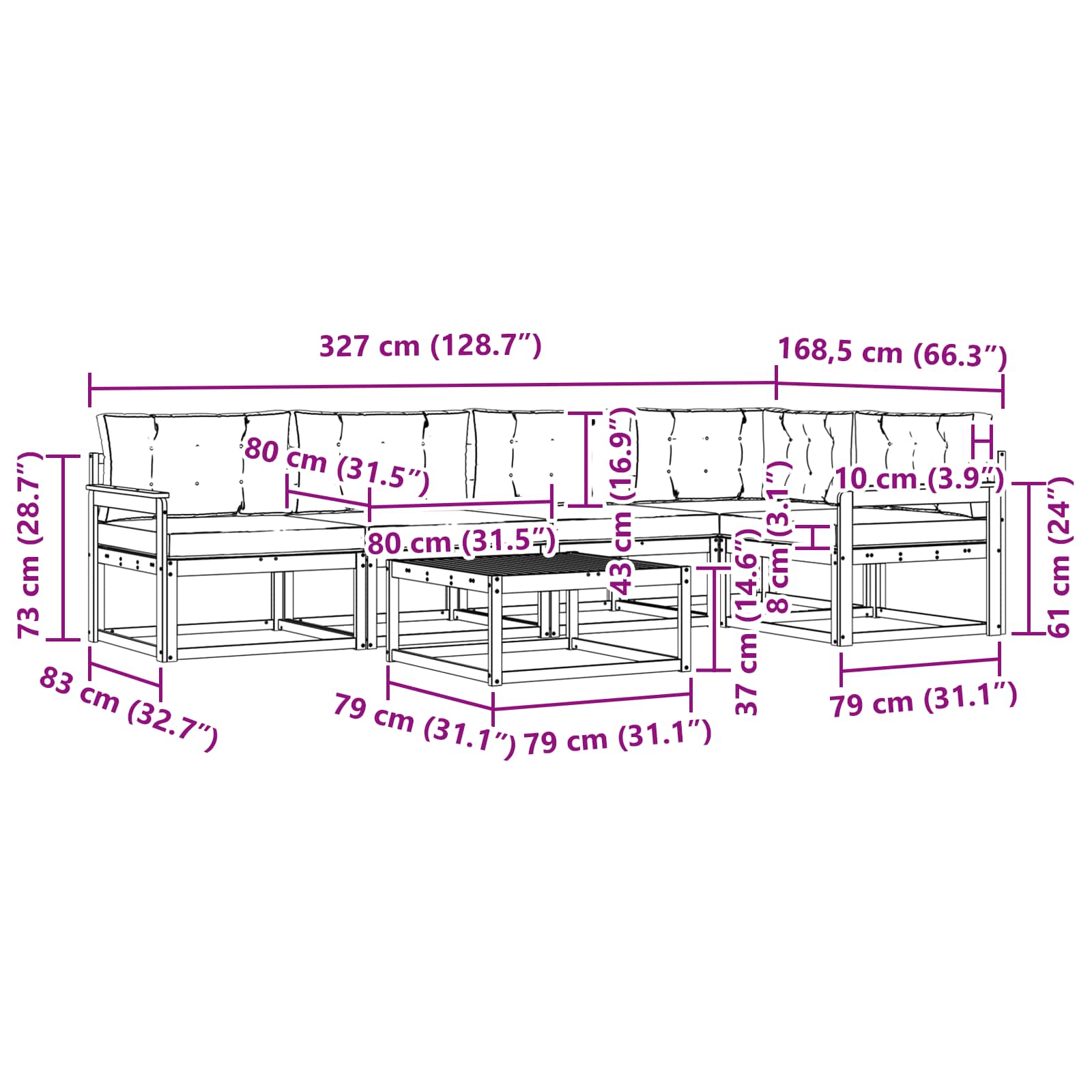 • 4 x Střední pohovka: 79 x 83 x 73 cm (D x Š x V)