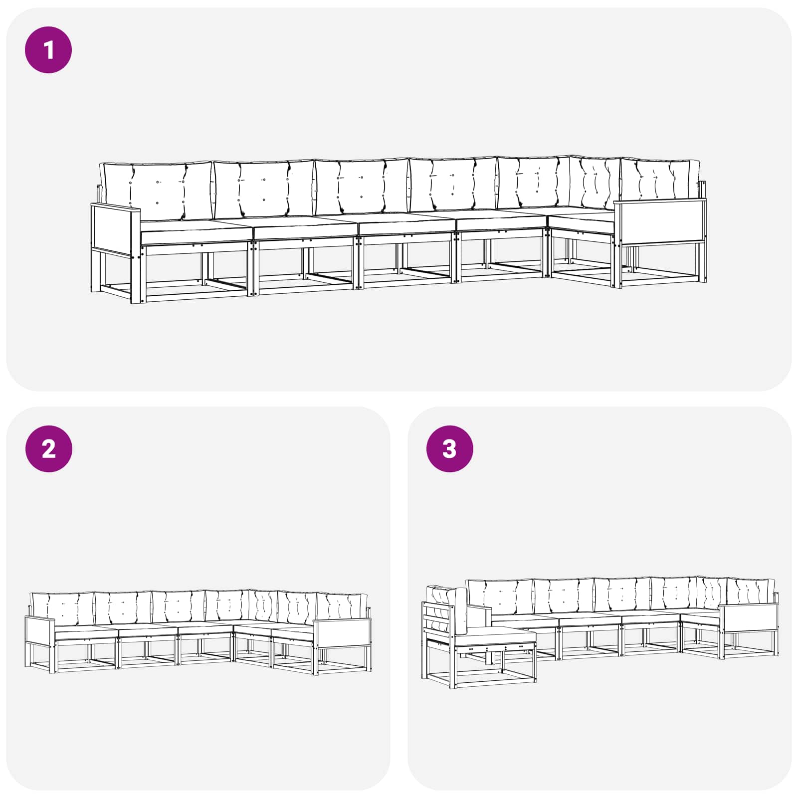 Tato venkovní rohová sedačka přináší moderní styl do každé zahrady, terasy, dvora nebo okolí bazénu. Je navržená jako dokonalá kombinace stylu a jednoduchosti a má minimalistický design. Modulární funkce vám umožňuje přizpůsobit uspořádání, ať už chcete být víc společensky, nebo preferujete intímnější setkání. Tato elegantní sada zve k odpočinku a je pečlivě zpracována, aby zaručila svoji robustnost a dlouhou životnost v každém venkovním prostoru.