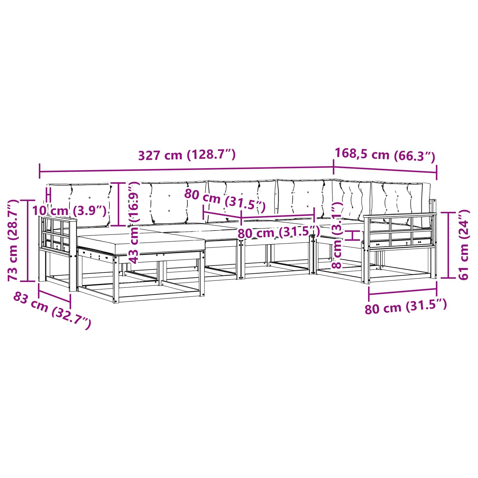 • 6 x Sedací polštář: 80 x 80 x 8 cm (D x Š x V)