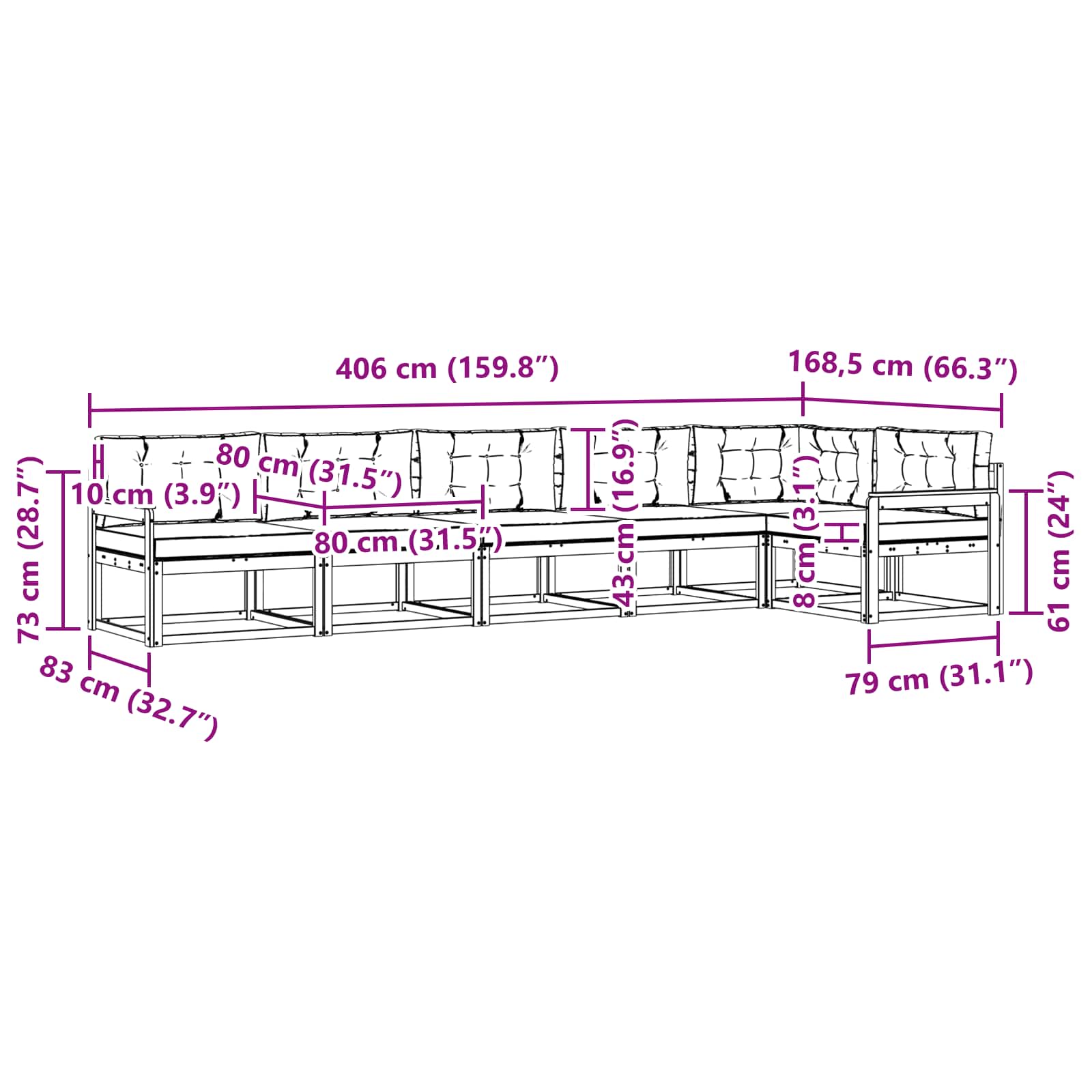 • 7 x Zadní polštář: 80 x 43 x 10 cm (D x Š x V)