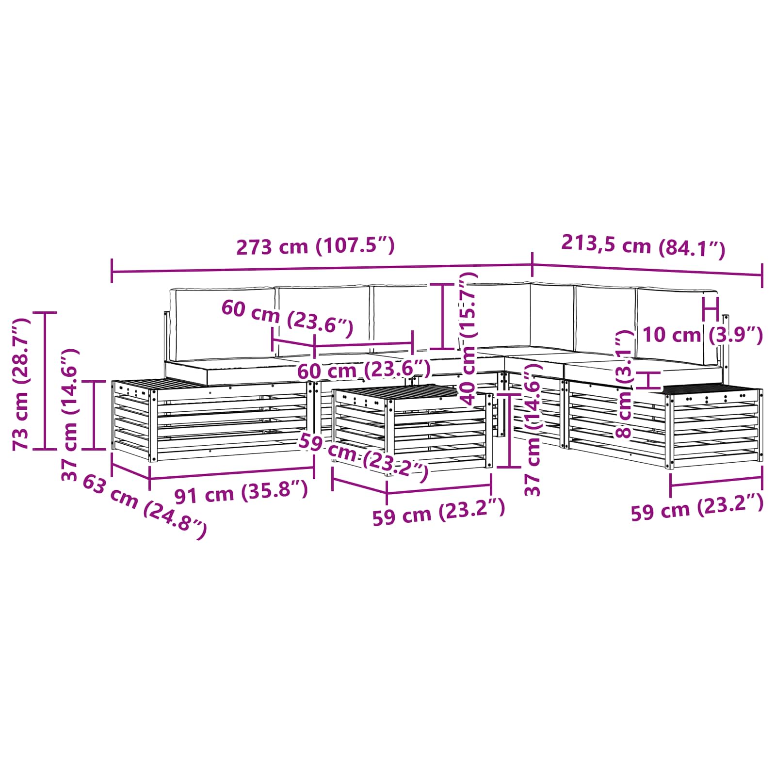 • 2 x Konečná pohovka: 91 x 63 x 73 cm (D x Š x V)