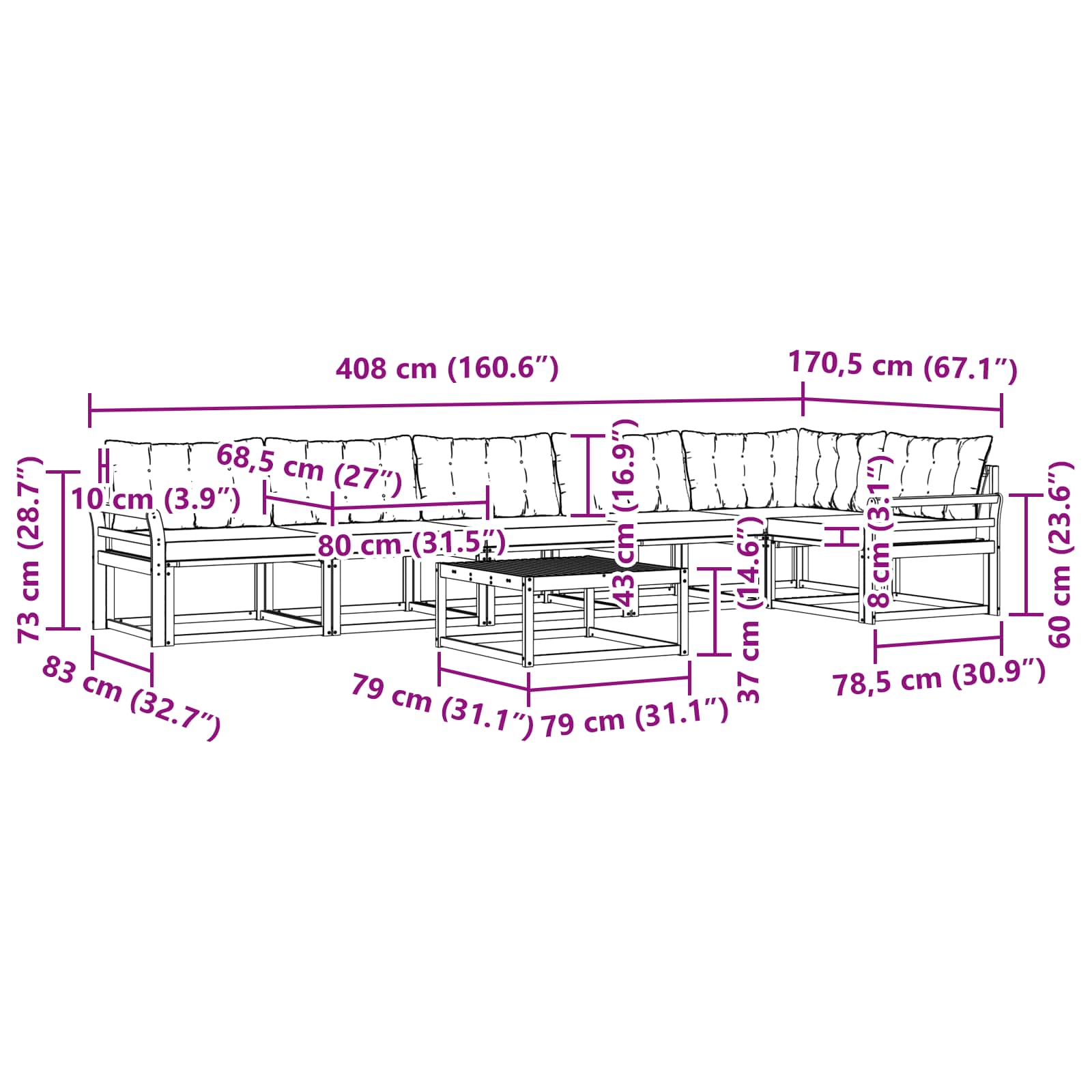 Tato venkovní nábytková sada spojuje styl s praktičností a vytváří atraktivní středobod pro každou zahradu nebo terasu. Moderní design s čistými liniemi a minimem zdobení přidává elegance a podporuje relaxaci a společenské aktivity venku. Vyrobená z masivního akáciového dřeva, zajišťuje odolnost a dlouhotrvající vzhled, takže je ideální volbou pro ty, kteří chtějí spojit funkčnost s rafinovaným stylem ve venkovním nábytku.