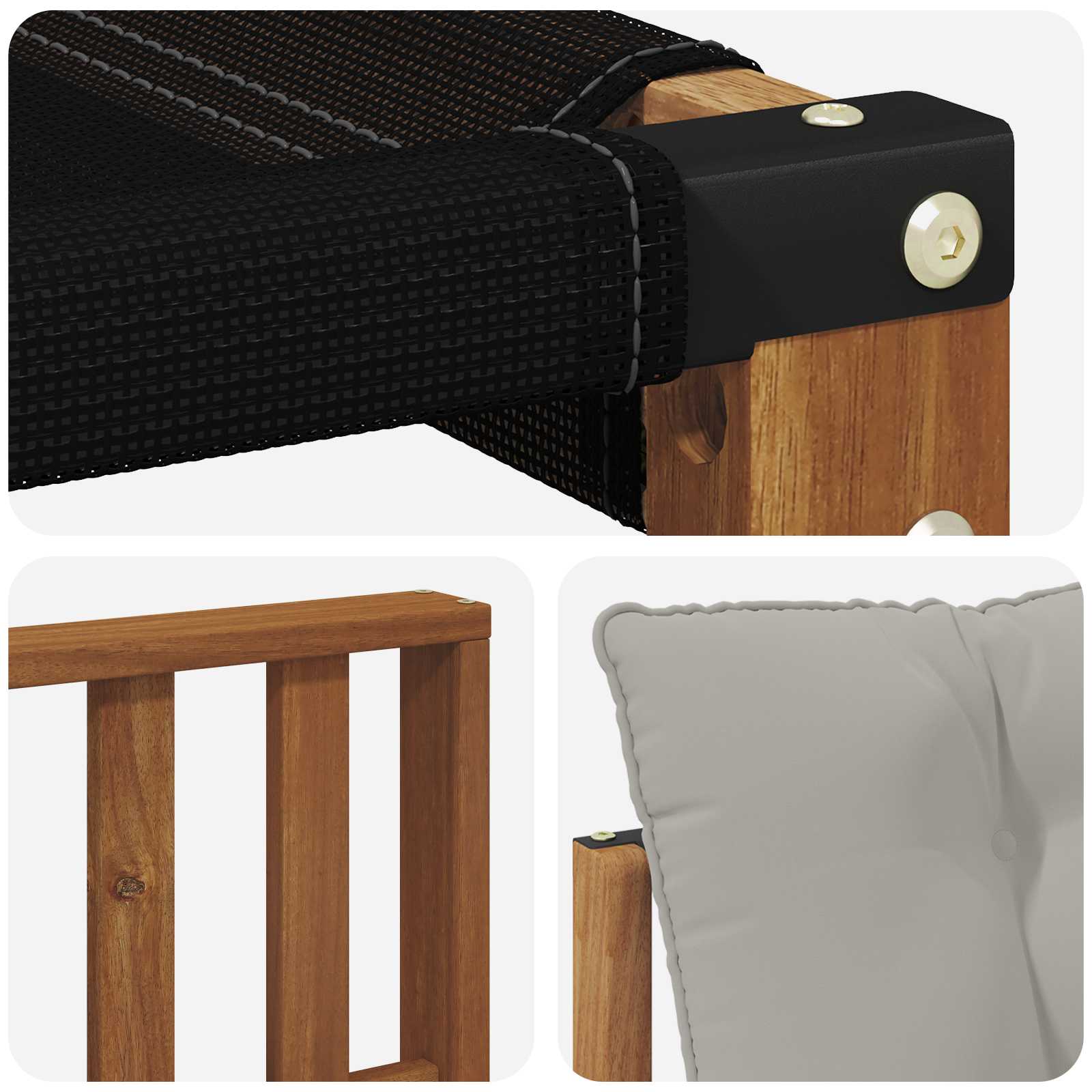 • Materiály: Vyrobeno z masivního akáciového dřeva, tahle souprava dodává zahradě přírodní a zemitý vzhled. Robustní dřevo zajišťuje stabilitu a styl, po léta si zachovává krásu a funkčnost.