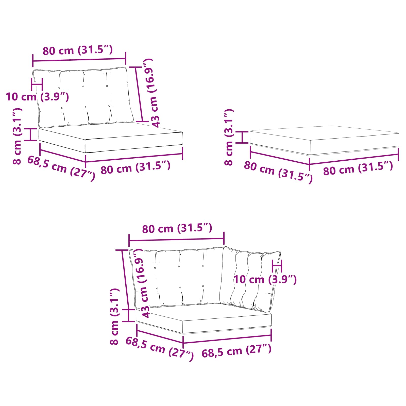 • 1 x Sedák: 80 x 80 x 8 cm (D x Š x V)