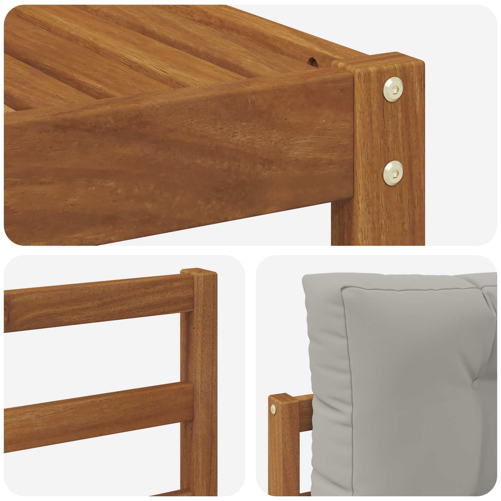 • Stavba z akácie: Sedací souprava z masivní akácie vypadá přírodně a dodává šmrnc venkovním prostorům. Akácie je dostatečně odolná vůči různému počasí, takže ti nábytek zachová krásu i po změnách sezón. Její přirozeně hnědá barva obohacuje zahradu a zajišťuje snadnou údržbu.