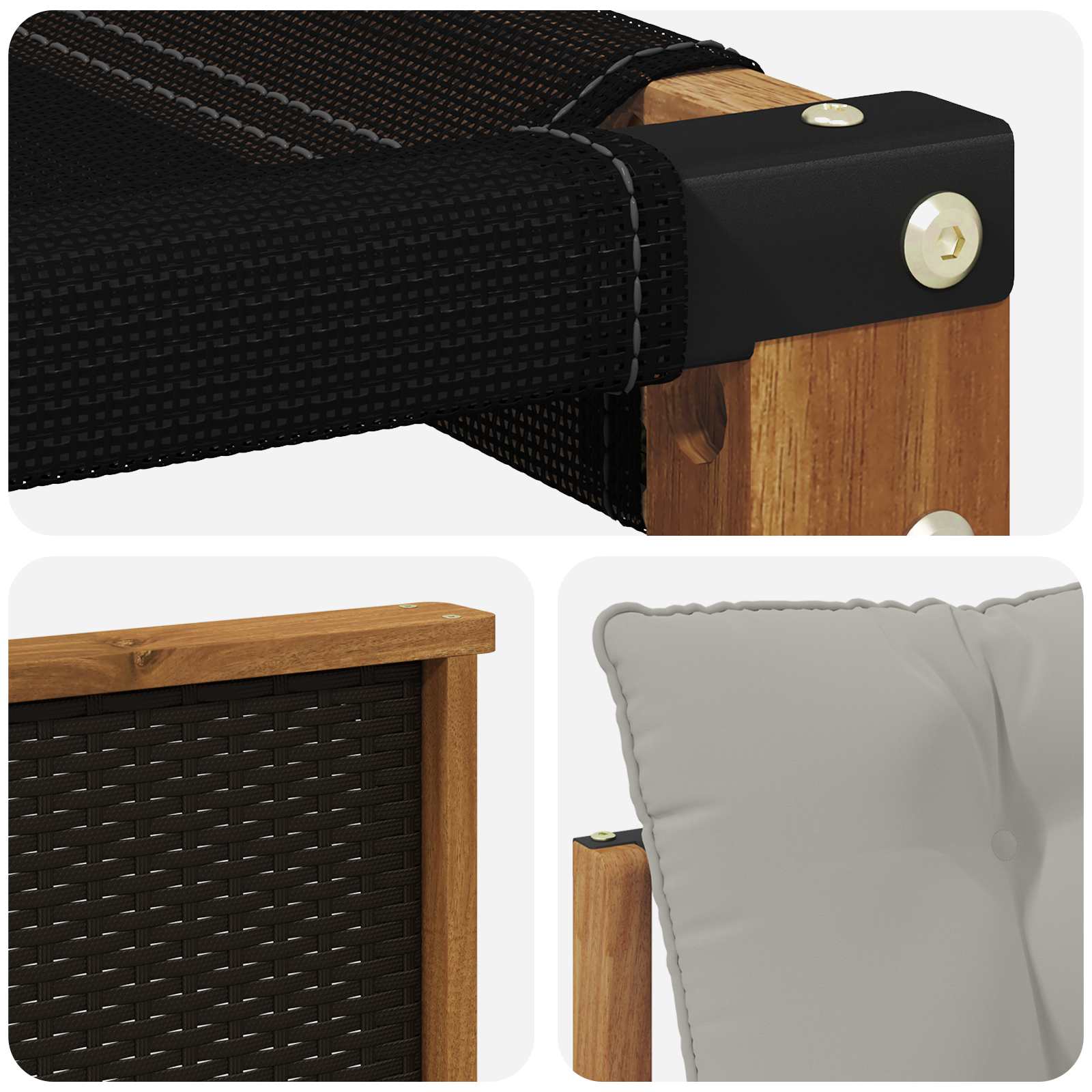 • Odolný rám z masivního akáciového dřeva: Tato venkovní sada nábytku je robustní, stabilní a připravená na venkovní podmínky. Pevná konstrukce zajišťuje dlouhou životnost a přírodní odstín skvěle doplní zahradu nebo terasu.