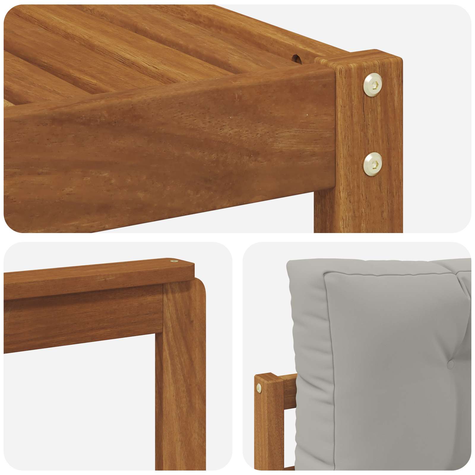 • Stavba z akácie: Sedací souprava z masivní akácie vypadá přírodně a dodává šmrnc venkovním prostorům. Akácie je dostatečně odolná vůči různému počasí, takže ti nábytek zachová krásu i po změnách sezón. Její přirozeně hnědá barva obohacuje zahradu a zajišťuje snadnou údržbu.