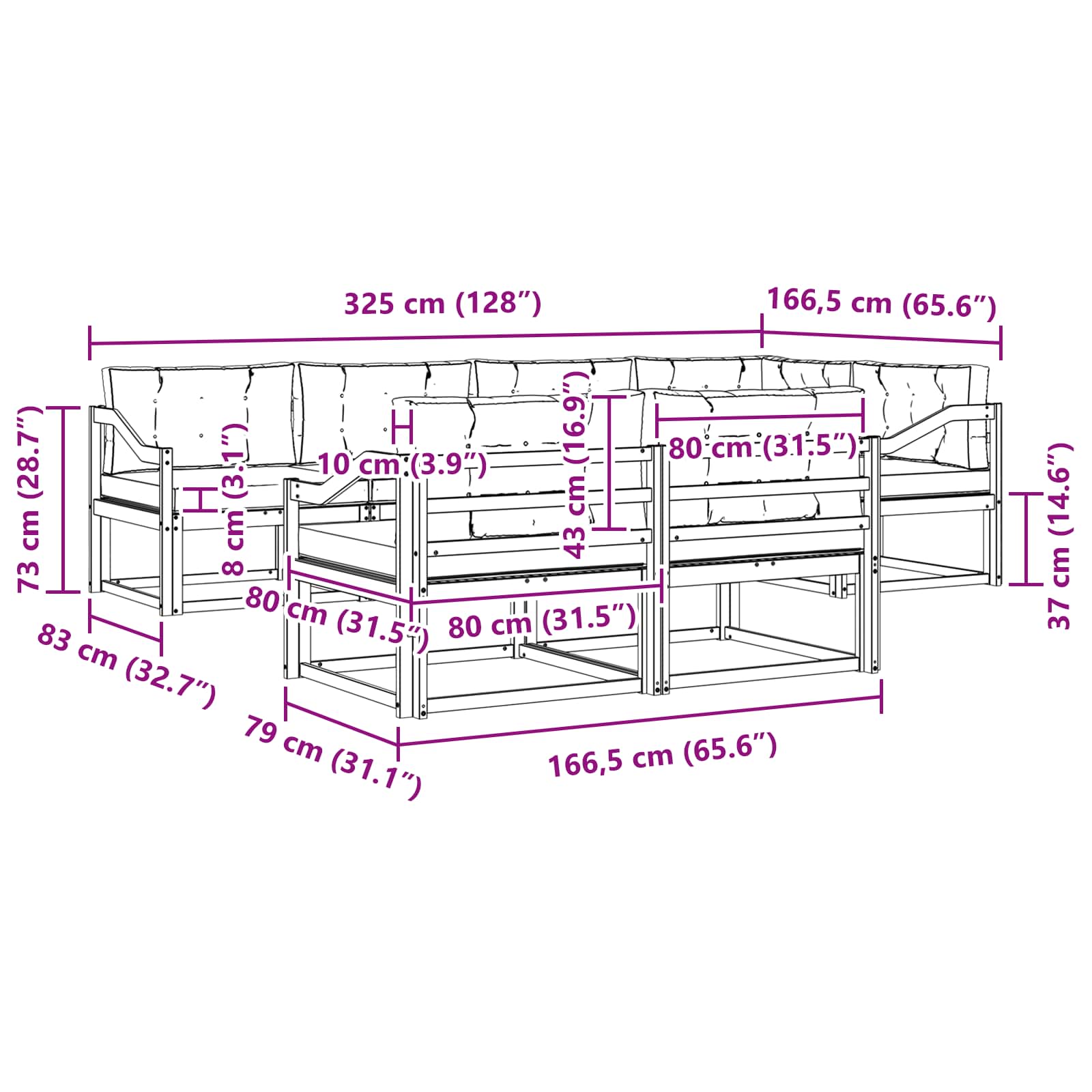 • 6 x Střední pohovka: 79 x 83 x 73 cm (D x Š x V)