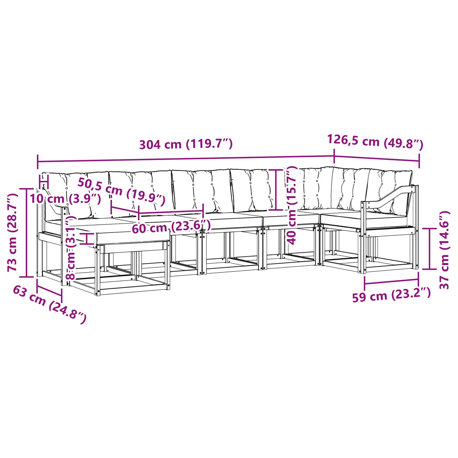 • 5 x Středová pohovka: 59 x 63 x 73 cm (DxŠxV)
