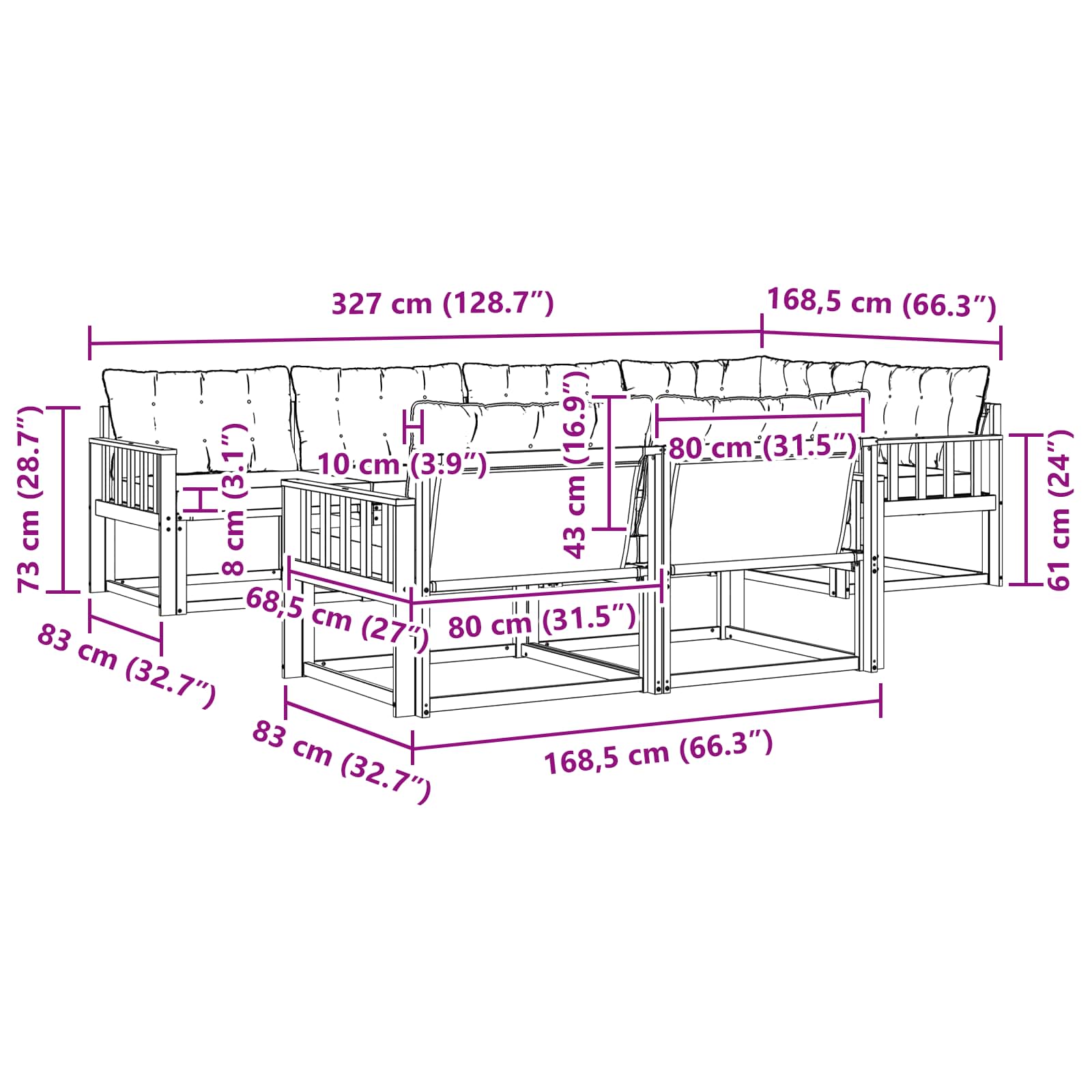 • 6 x středová pohovka: 79 x 83 x 73 cm (D x Š x V)