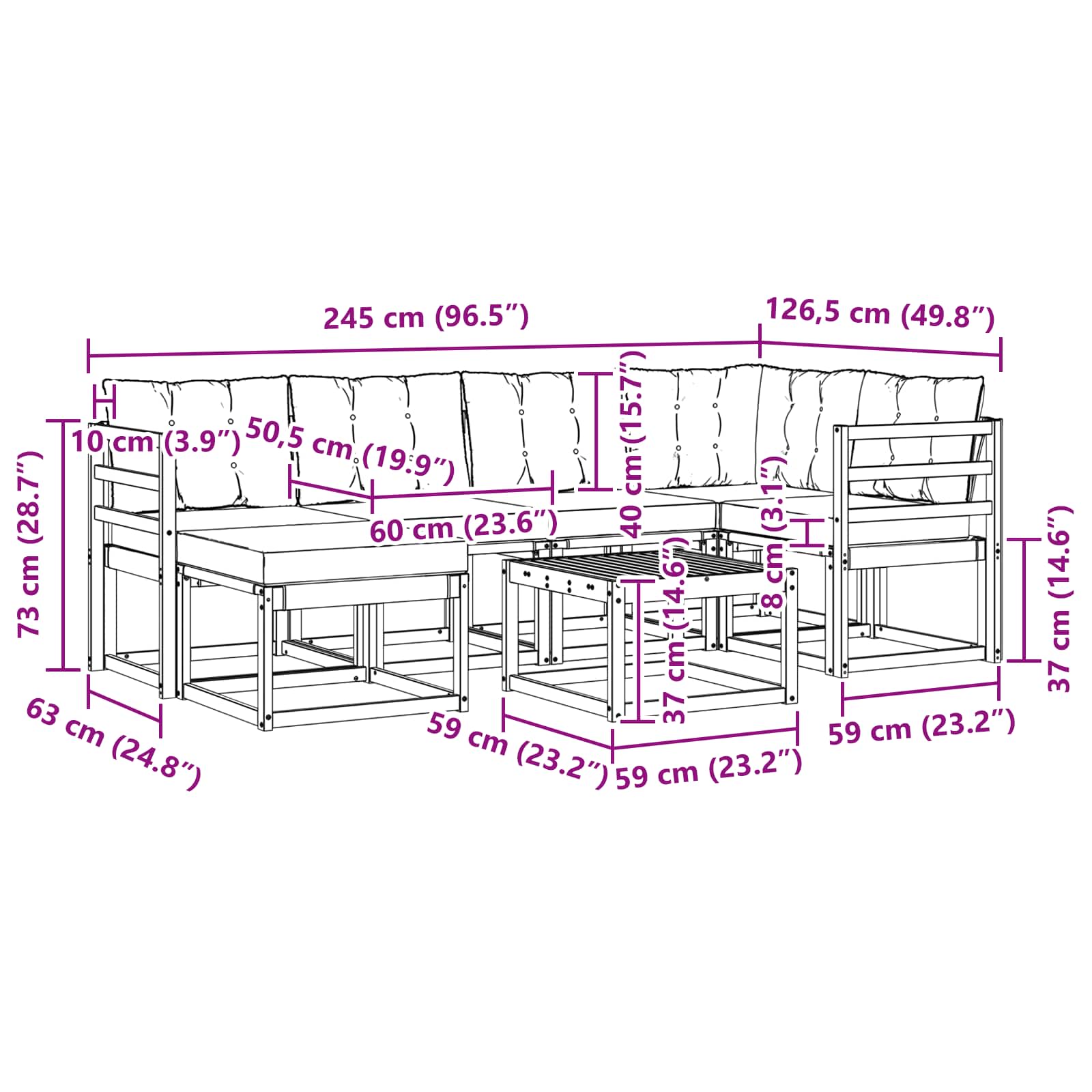 • 4 x Středová pohovka: 59 x 63 x 73 cm (D x Š x V)