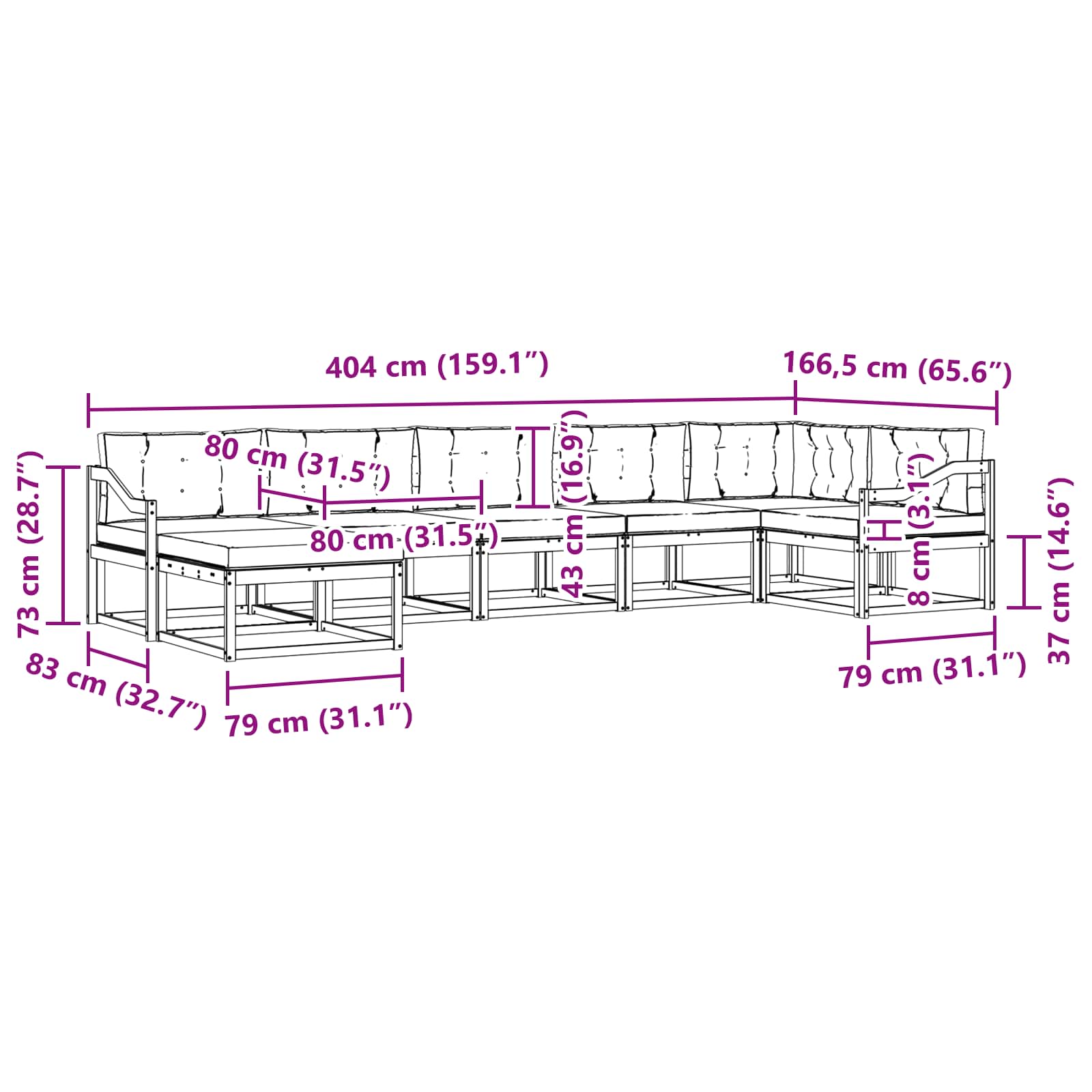 • 5 x Střední pohovka: 79 x 83 x 73 cm (D x Š x V)