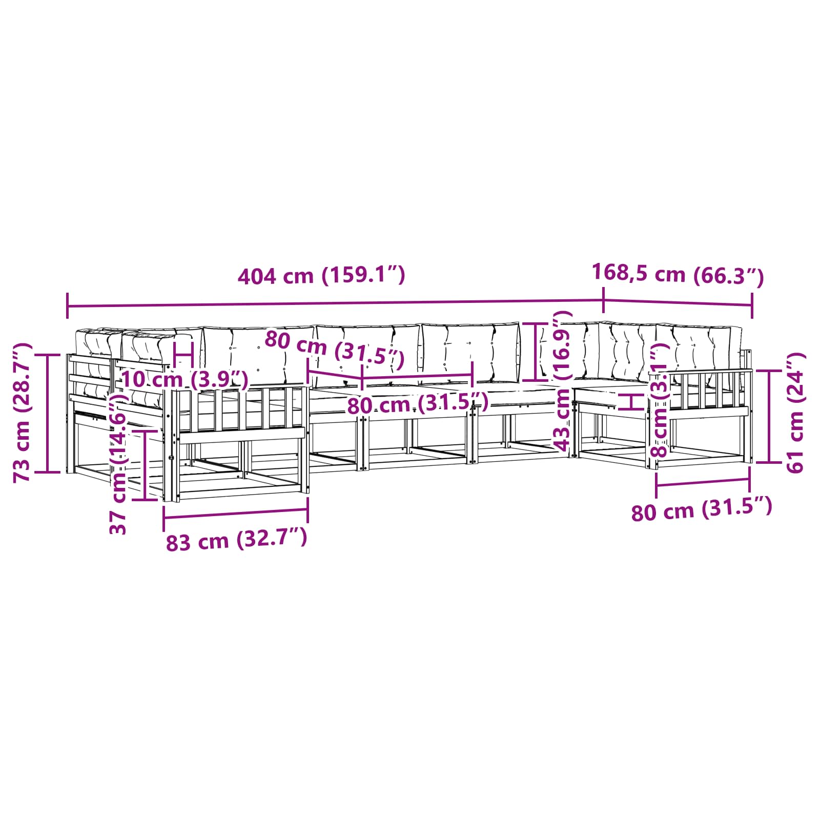• 7 x Sedací polštář: 80 x 80 x 8 cm (D x Š x V)