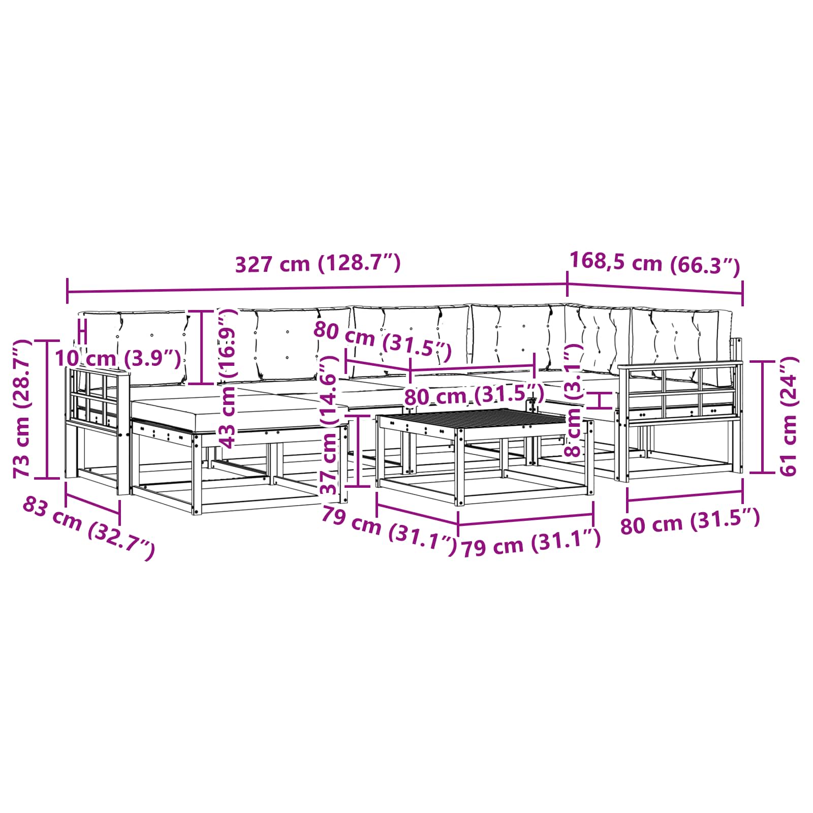 • 6 x Sedací polštář: 80 x 80 x 8 cm (D x Š x V)