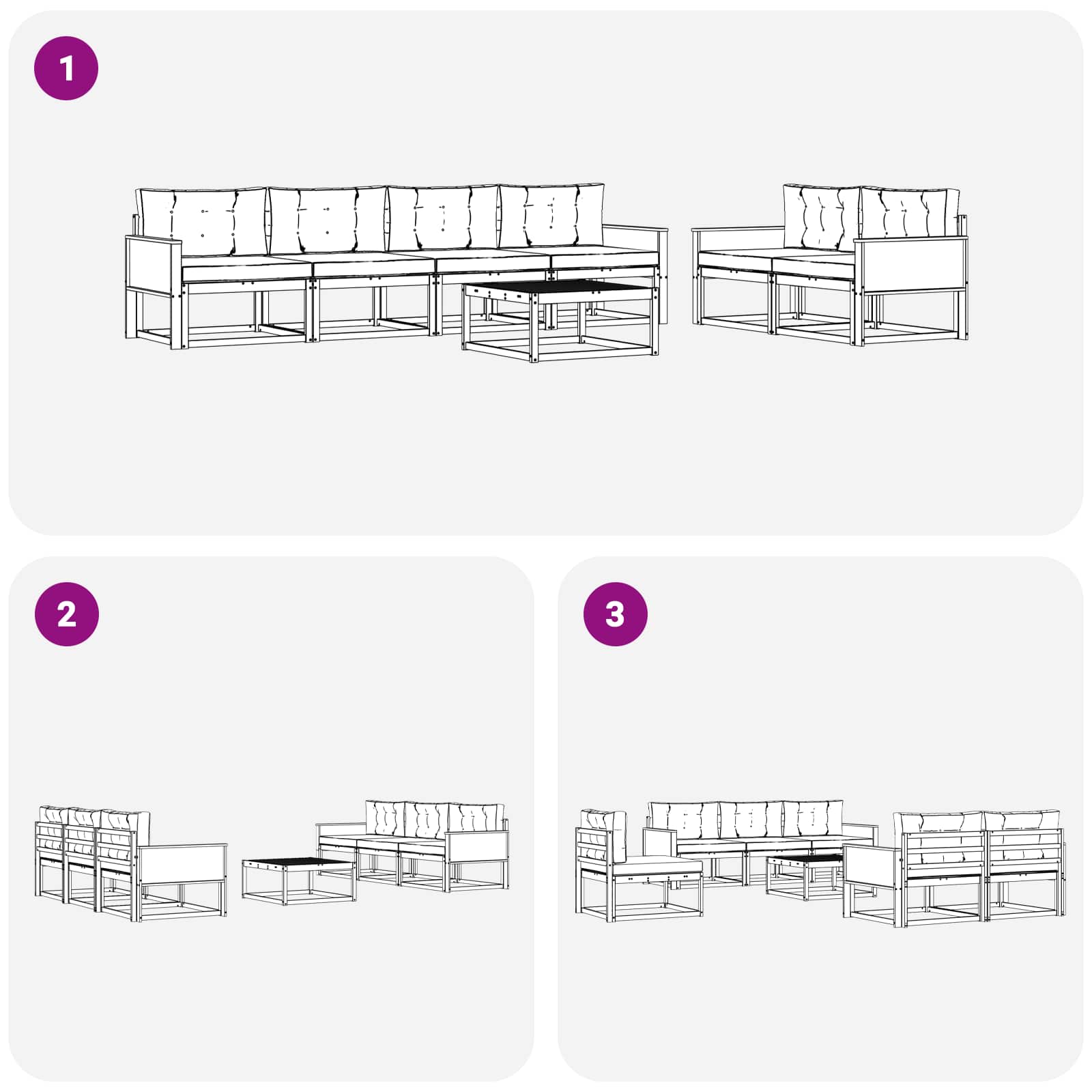 Tato sedací souprava promění vaši zahradu, terasu nebo místo u bazénu na útočiště, které zve k relaxaci svým krásným designem. S důrazem na jednoduchost a funkčnost přináší moderní styl, který skvěle zapadne do venkovního prostředí. Lamelový design propouští vzduch a vytváří příjemnou atmosféru pro sluníčkové rozhovory nebo setkání večer pod hvězdami.