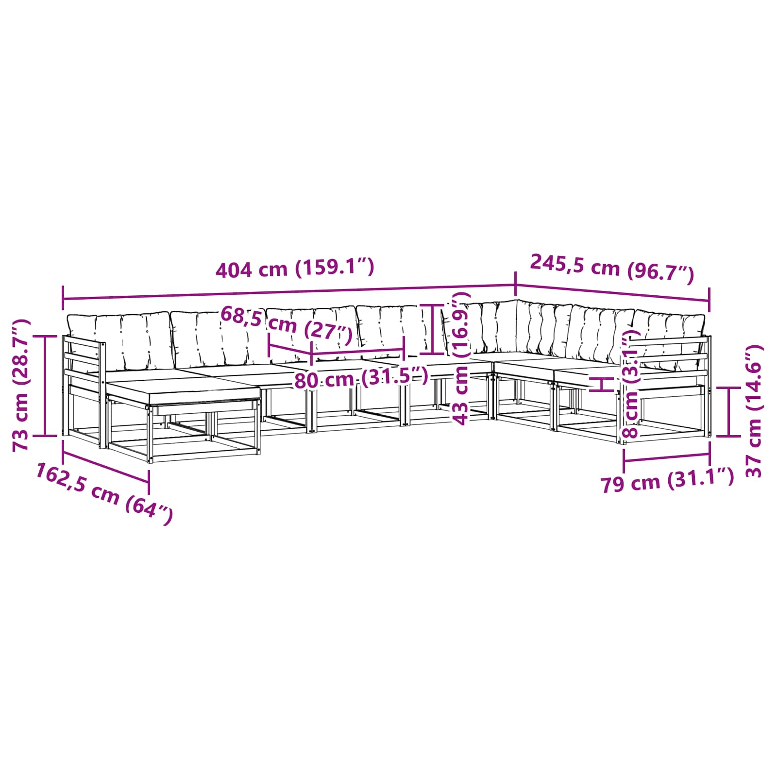 • 8 x opěradlový polštář: 80 x 43 x 10 cm (D x Š x V)