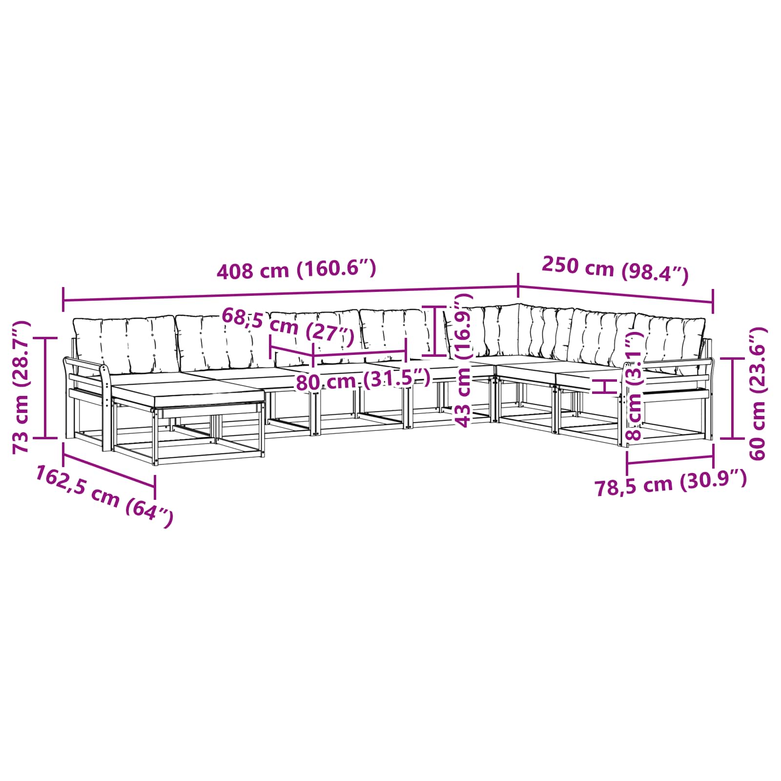 • 8 x opěradlový polštář: 80 x 43 x 10 cm (D x Š x V)