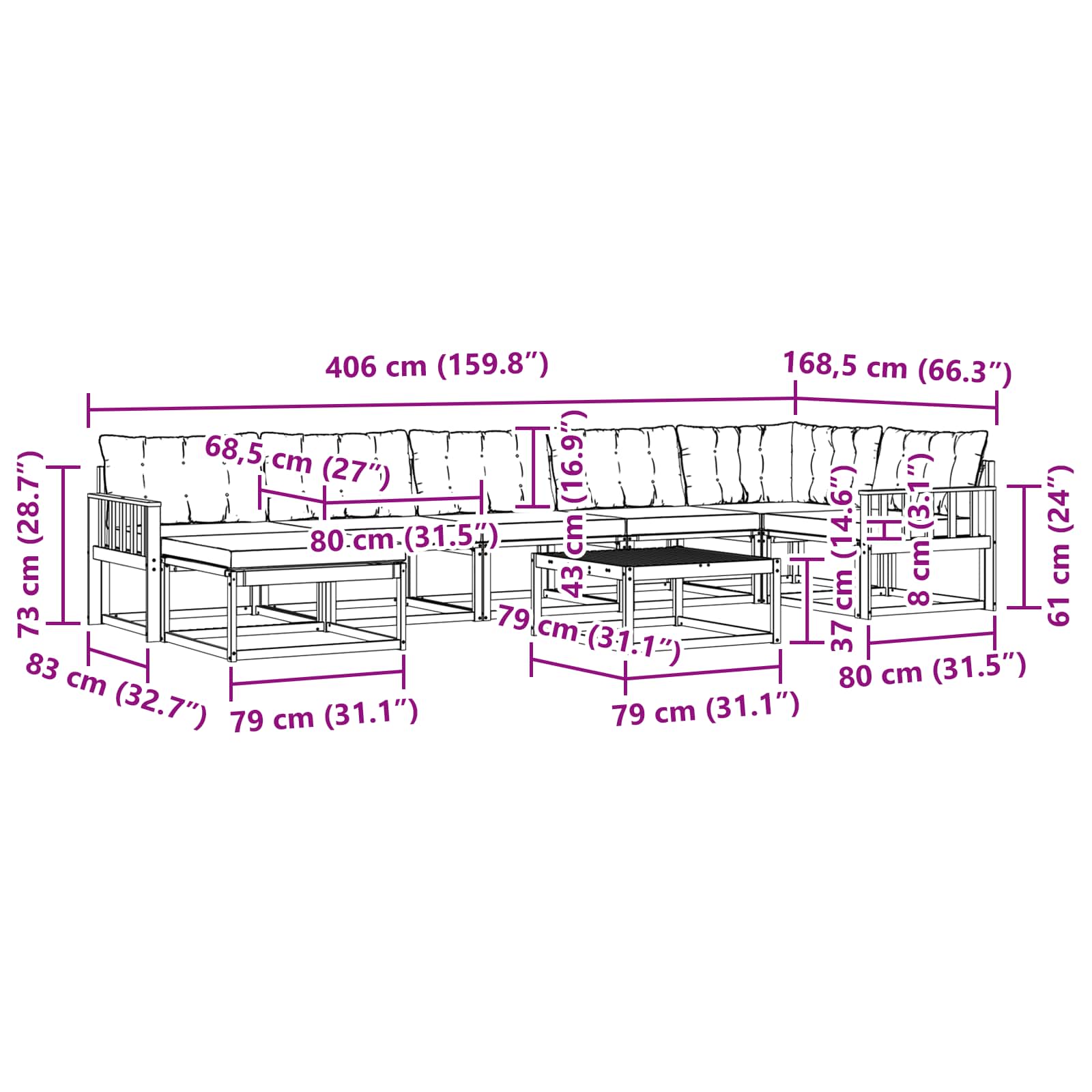 • 5 x Polštář na sezení: 80 x 68,5 x 8 cm (D x Š x V)