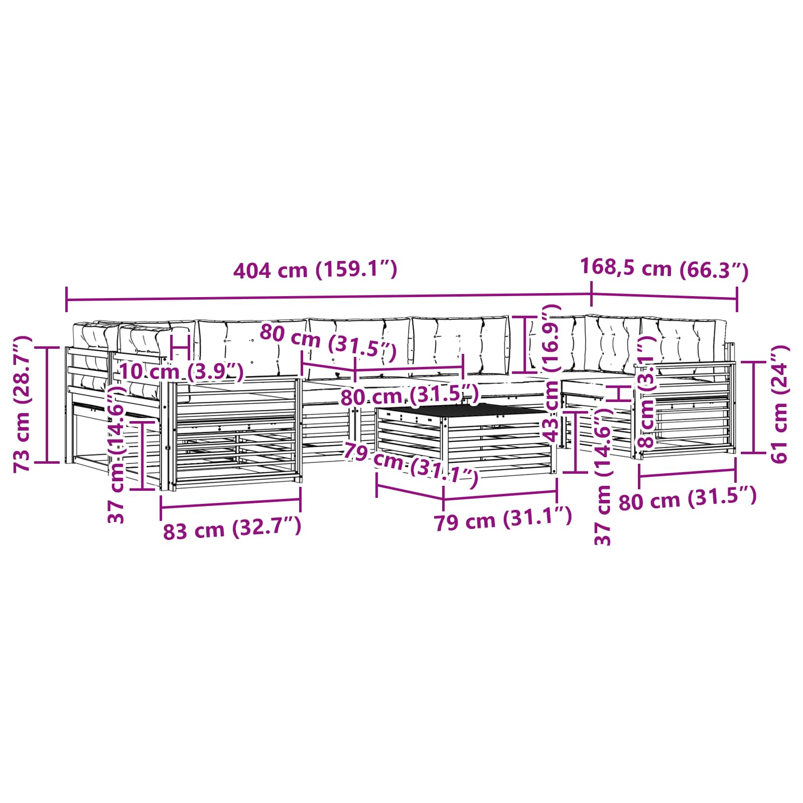 • 5 x středová pohovka: 79 x 83 x 73 cm (DxŠxV),2 x rohová pohovka: 83 x 83 x 73 cm (DxŠxV)
