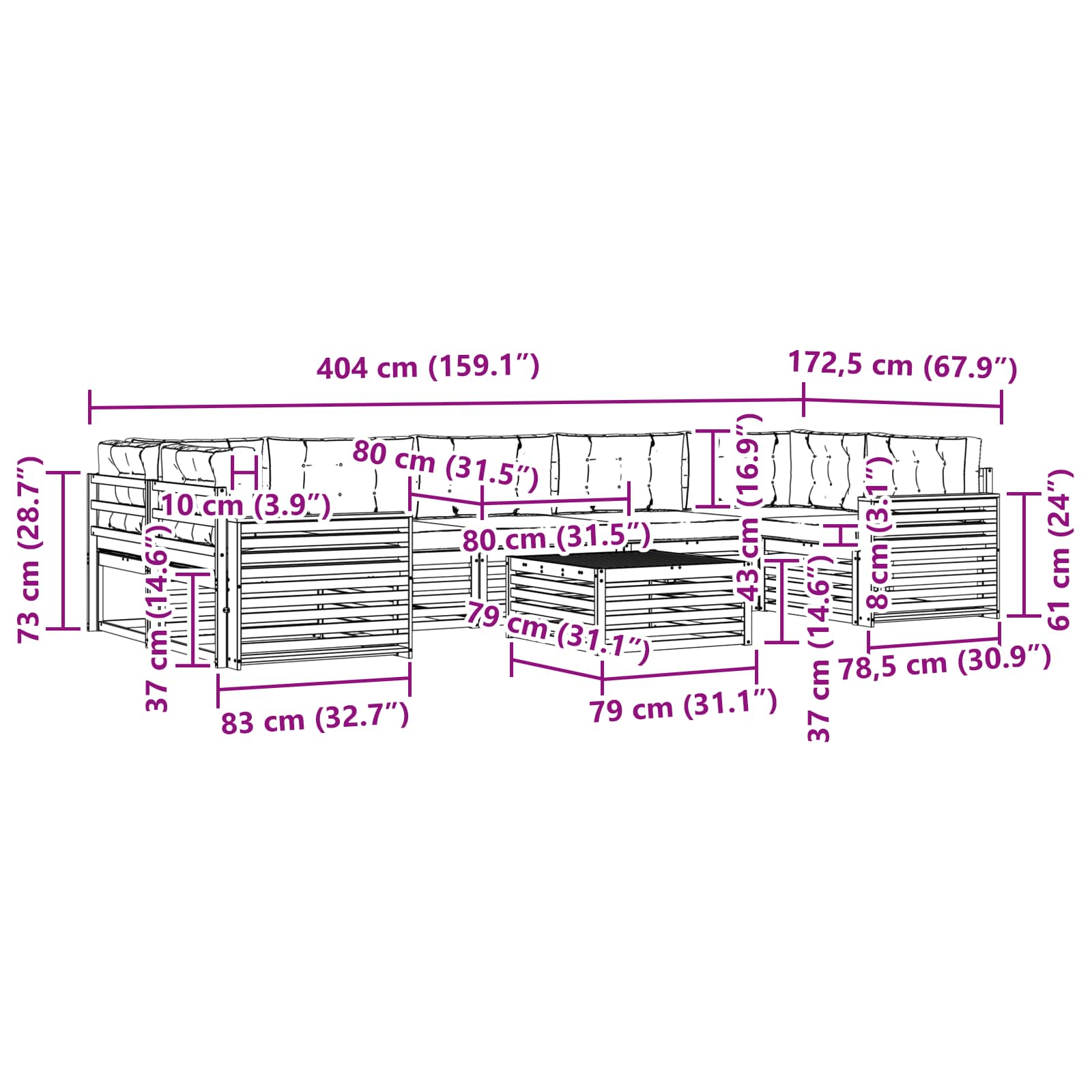 • 5 x středová pohovka: 79 x 83 x 73 cm (DxŠxV),2 x rohová pohovka: 83 x 83 x 73 cm (DxŠxV)