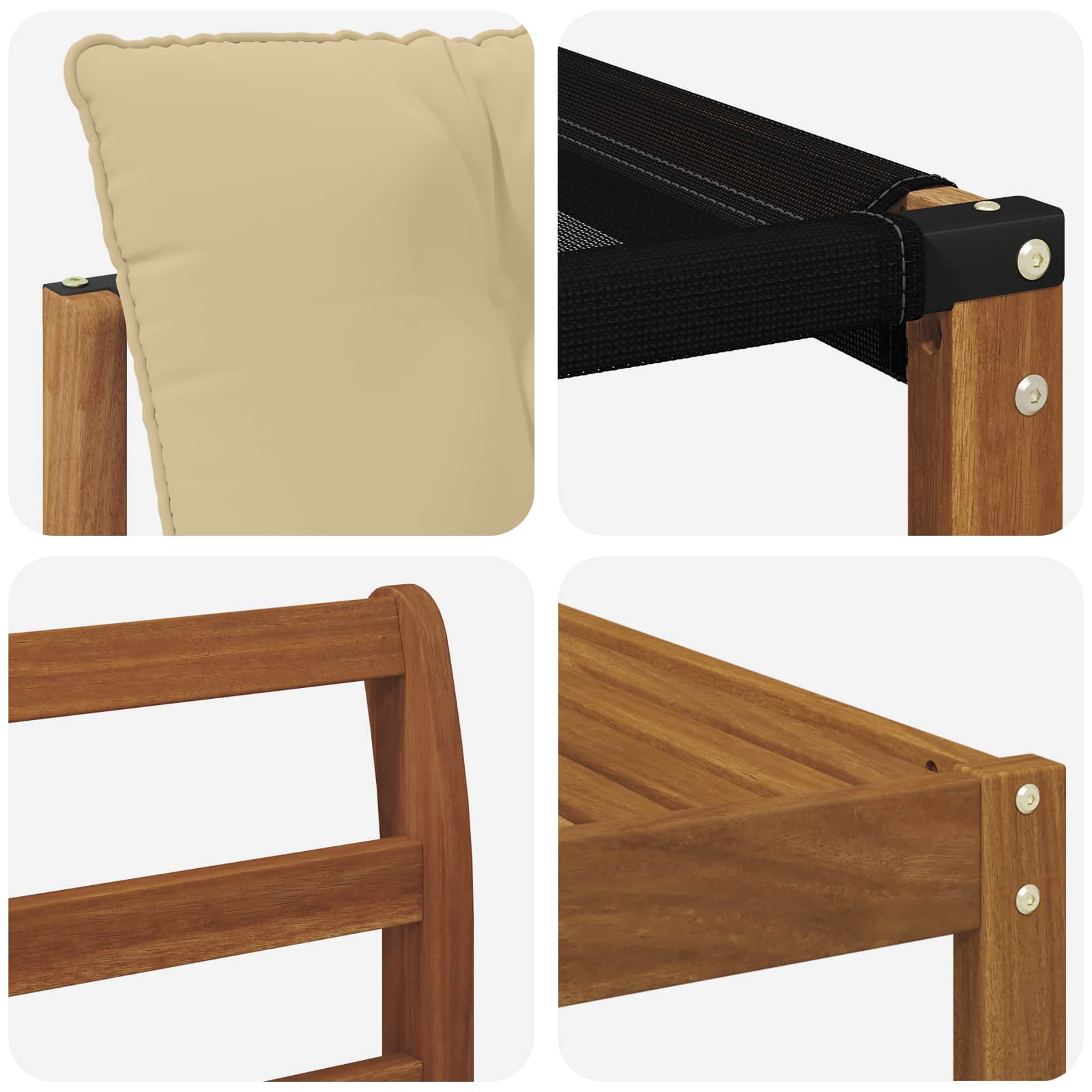• Odolné masivní akáciové dřevo: Tento venkovní nábytek z akáciového dřeva je silný a zvládne venkovní podmínky. Konstrukce poskytuje skvělou oporu a stabilitu, zatímco teplý přírodní tón se hodí do jakékoli zahrady nebo terasy.