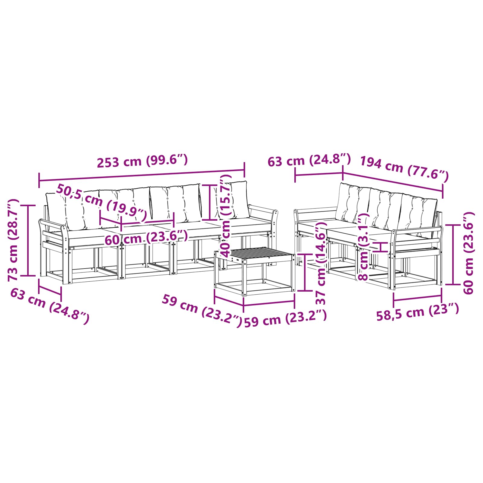 • 7 x Střední pohovka: 59 x 63 x 73 cm (D x Š x V)