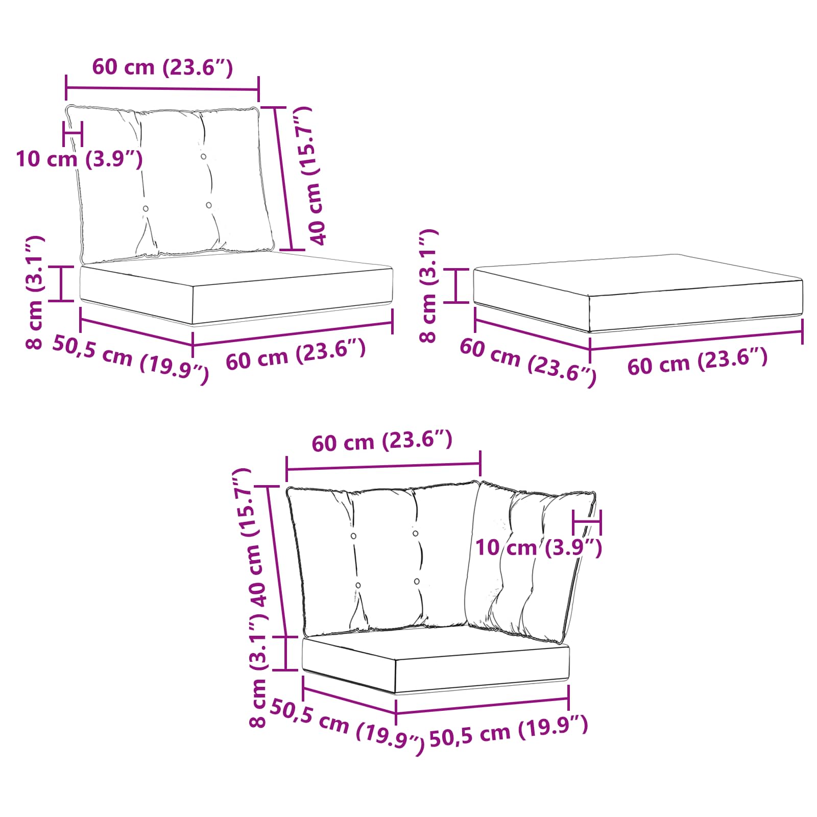• 6 x Polštář na sezení: 60 x 50,5 x 8 cm (DxŠxV)