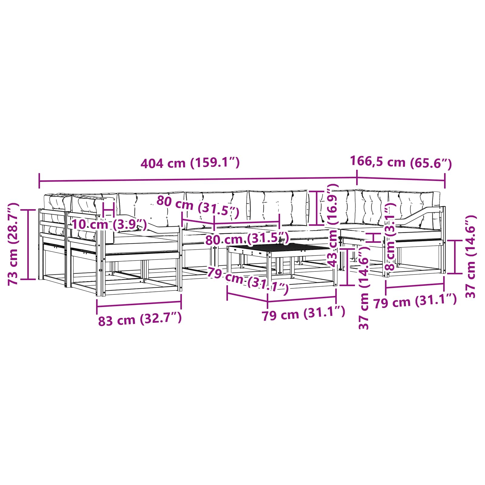 • 7 x sedací polštář: 80 x 80 x 8 cm (D x Š x V)