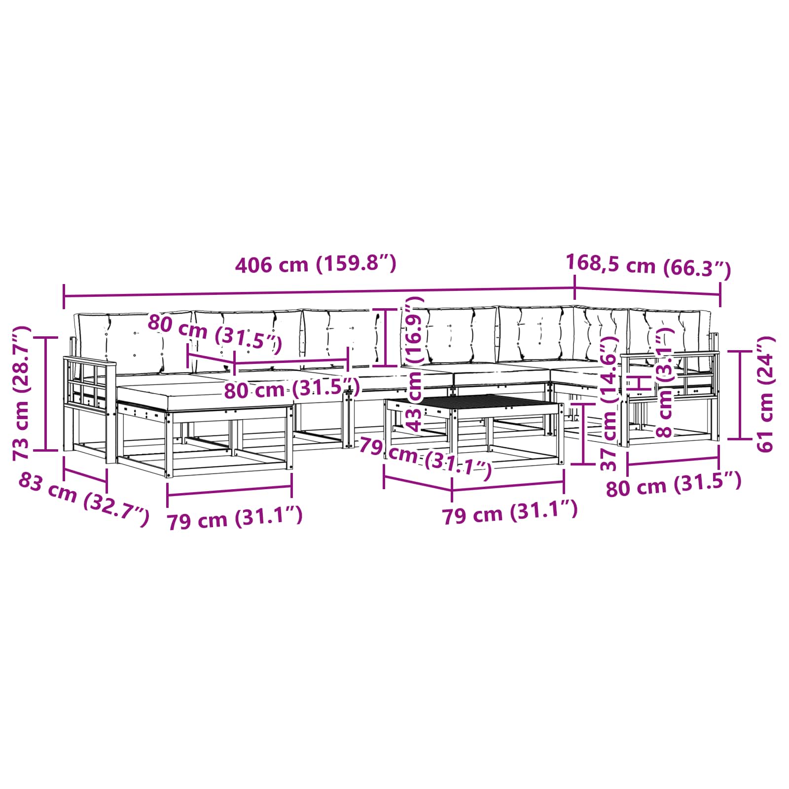• 5 x Střední pohovka: 79 x 83 x 73 cm (D x Š x V)